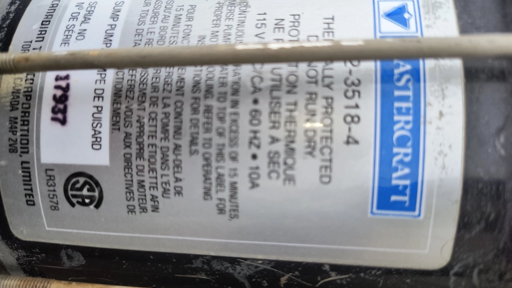 Master craft 10A sump pump.extra long cord,works awesome used twice,only needs discharge hose if you need(there cheap) can be run continuously or be float activated.great for basement sump or pond or wherever else water needs to be moved quickly