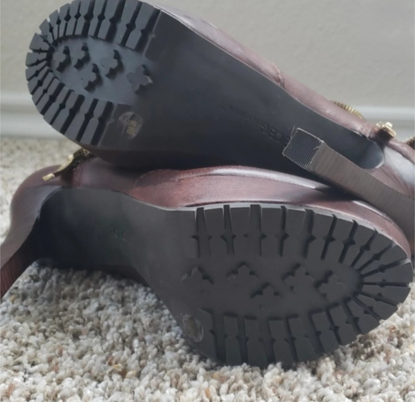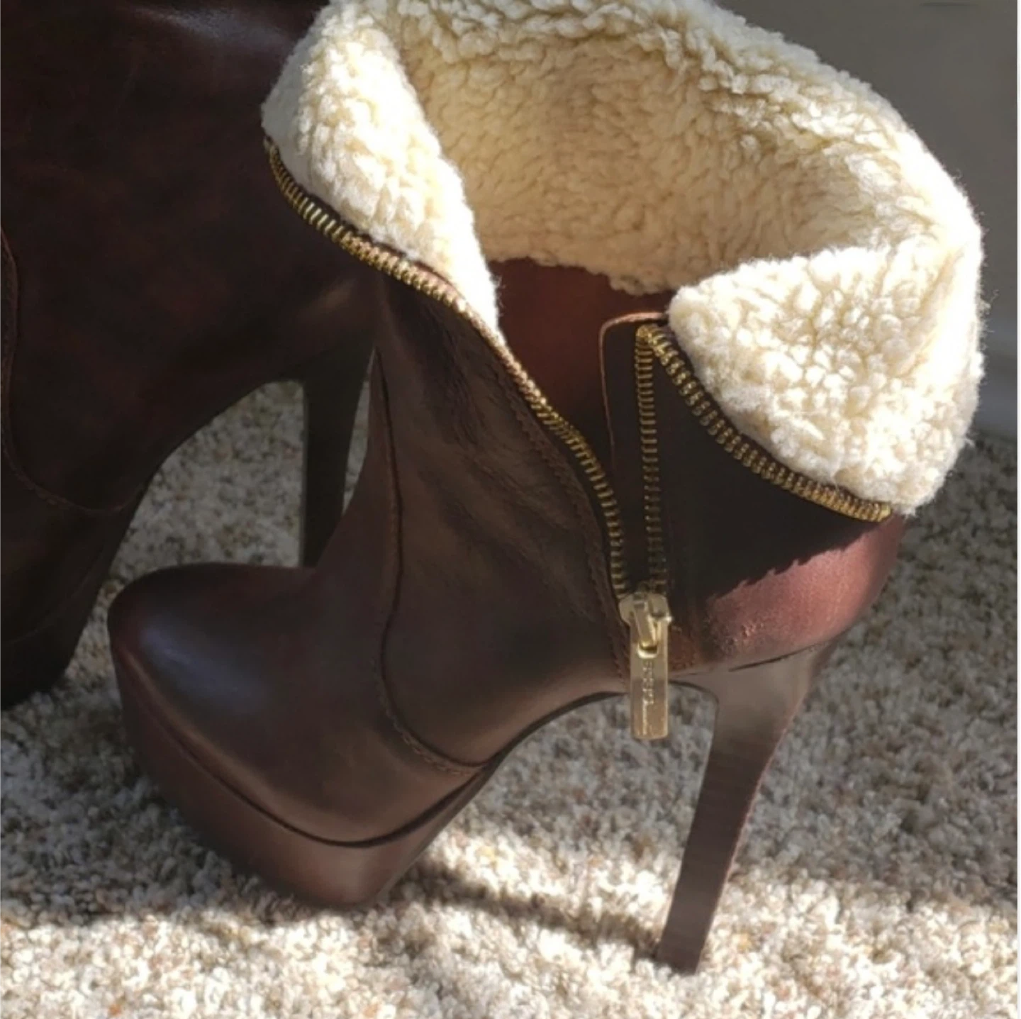 Stylish BCBGMaxAzria ankle boots with a rich brown leather exterior. These booties feature a cozy shearling lining and a fashionable platform heel. Side zipper for easy on and off!