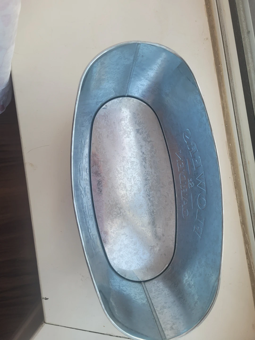 This galvanized tin planter is perfect for your flowers and garden. It's oval-shaped and made from durable metal. Use it to add a rustic touch to your outdoor space!