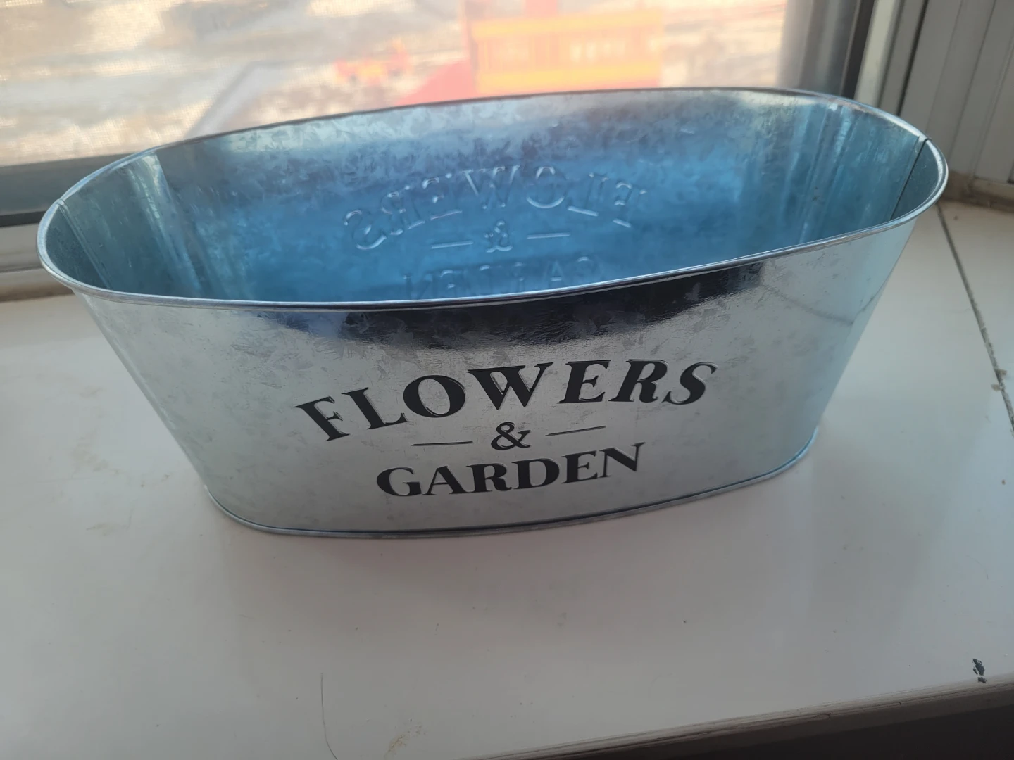 This galvanized tin planter is perfect for your flowers and garden. It's oval-shaped and made from durable metal. Use it to add a rustic touch to your outdoor space!