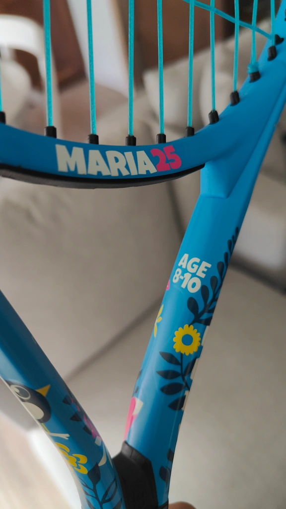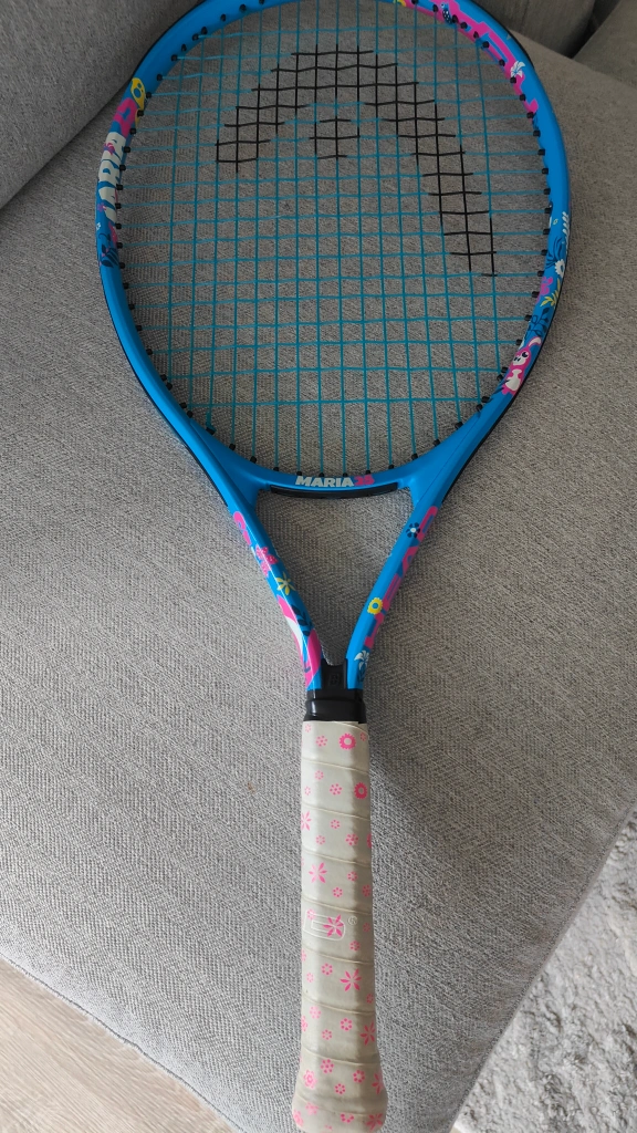 A blue tennis racquet. Floral design. Brightly coloured with a pink grip. A great way to relax, enjoy the sunshine, and get some exercise.