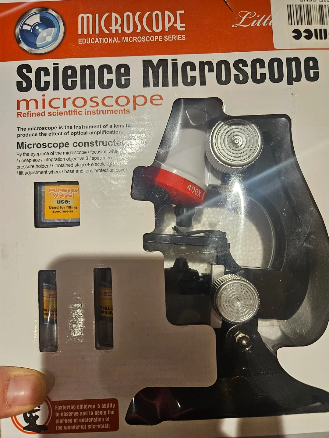 This educational science microscope is designed for beginners. It features a 400x magnification and includes specimen containers. It's great for fostering children's interest in science and exploration! My kids open the box and that was it it sat on the self for a year .
