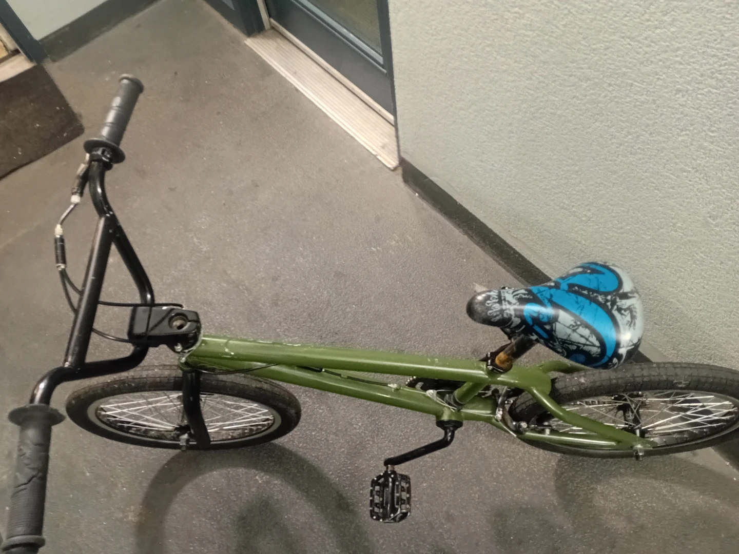 This is a green BMX bike with a blue and black patterned seat. It has a sturdy frame, perfect for riding around town or at the skatepark. in good condition.