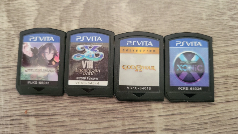 Four pre-owned Korean PlayStation Vita game cartridges, without case.