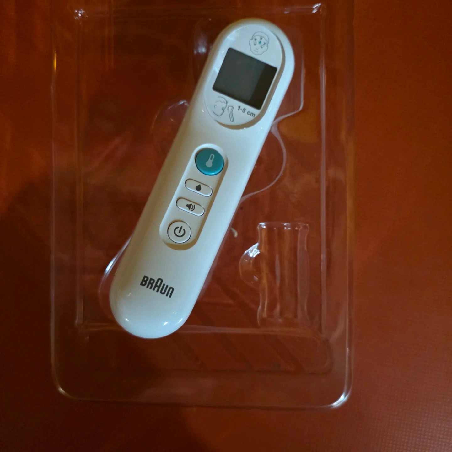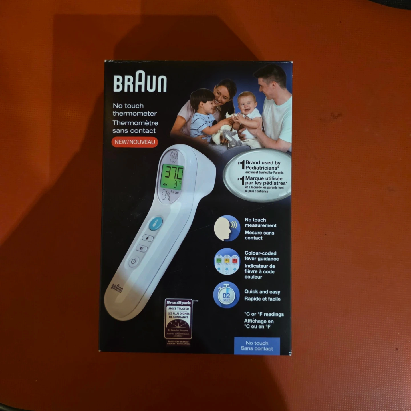 This is a Braun no-touch thermometer for fast and easy temperature readings. It features colour-coded fever guidance and can measure temperature from 1-5 cm away. It's brand used by pediatricians.