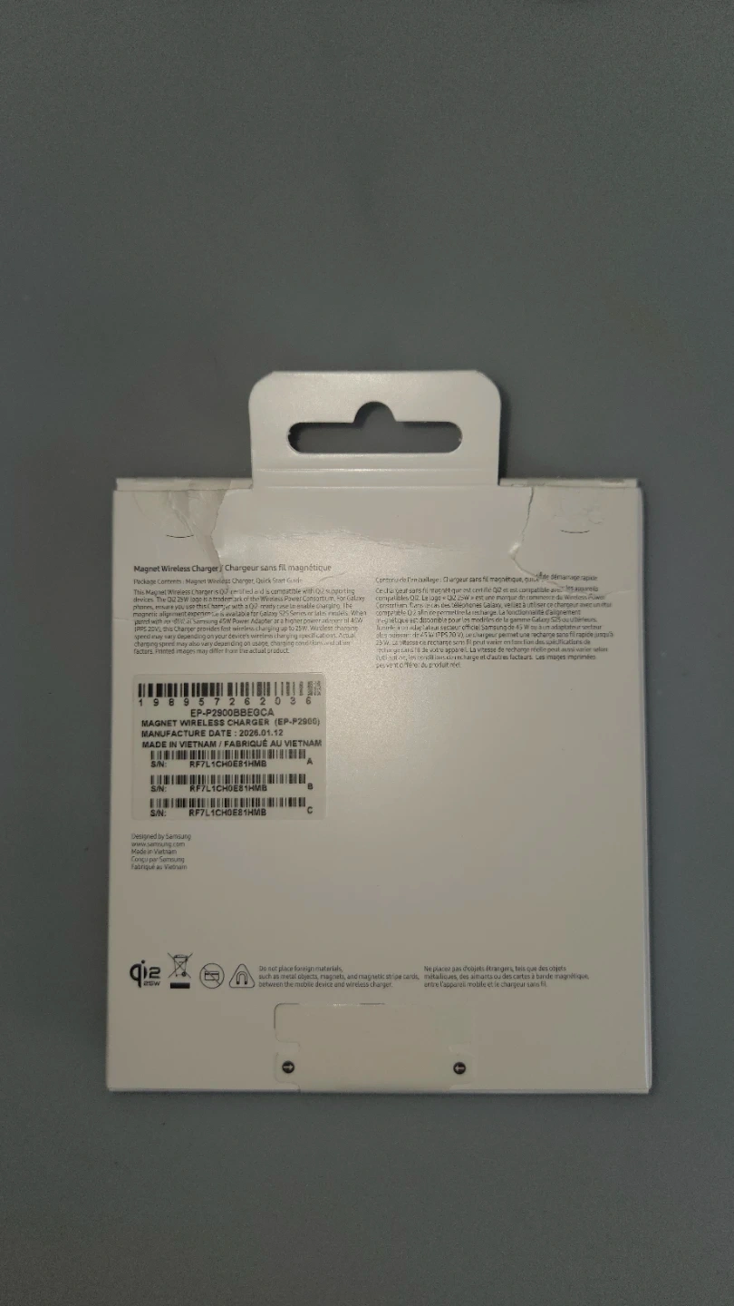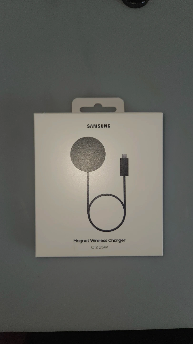 Samsung Magnet Wireless Charger, model EP-P2500. Used it once or twice which is why it's opened, but don't need it. It's a 25W Qi2 charger with a USB-C connector. Includes the charger and its attached cable!