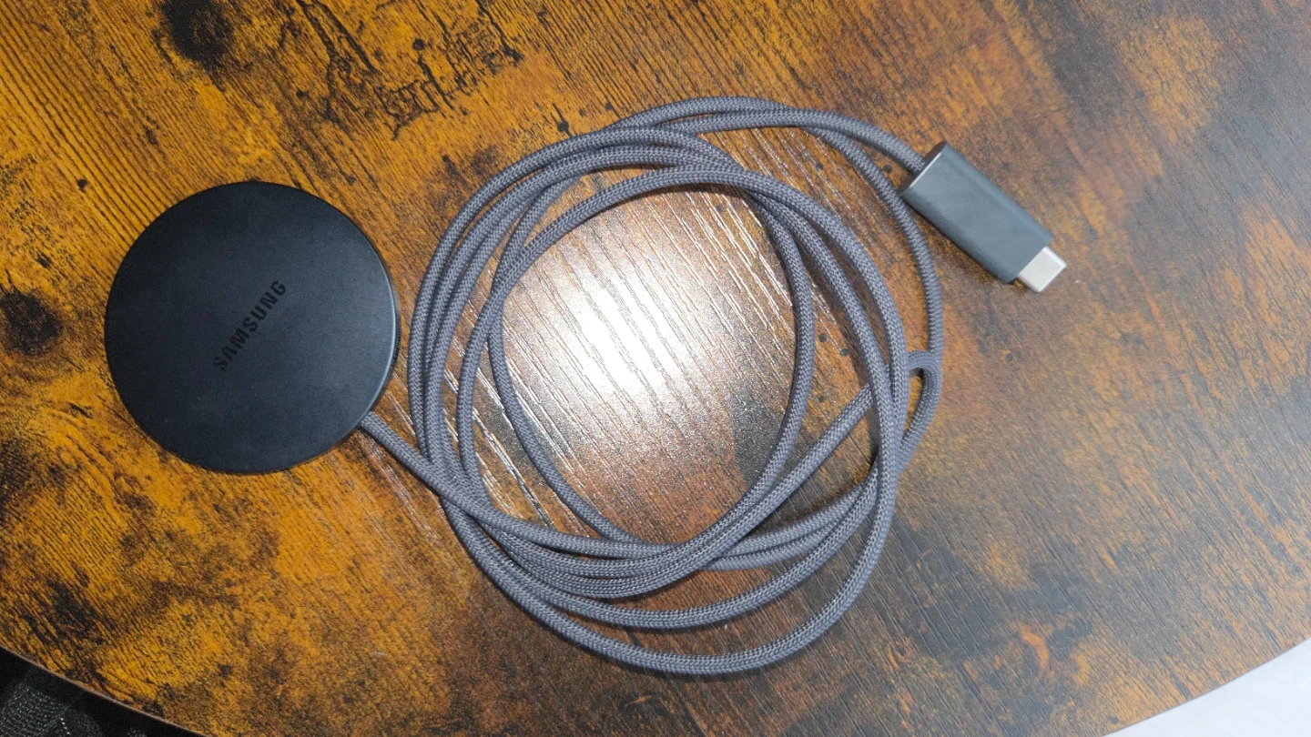 Samsung Magnet Wireless Charger, model EP-P2500. Used it once or twice which is why it's opened, but don't need it. It's a 25W Qi2 charger with a USB-C connector. Includes the charger and its attached cable!