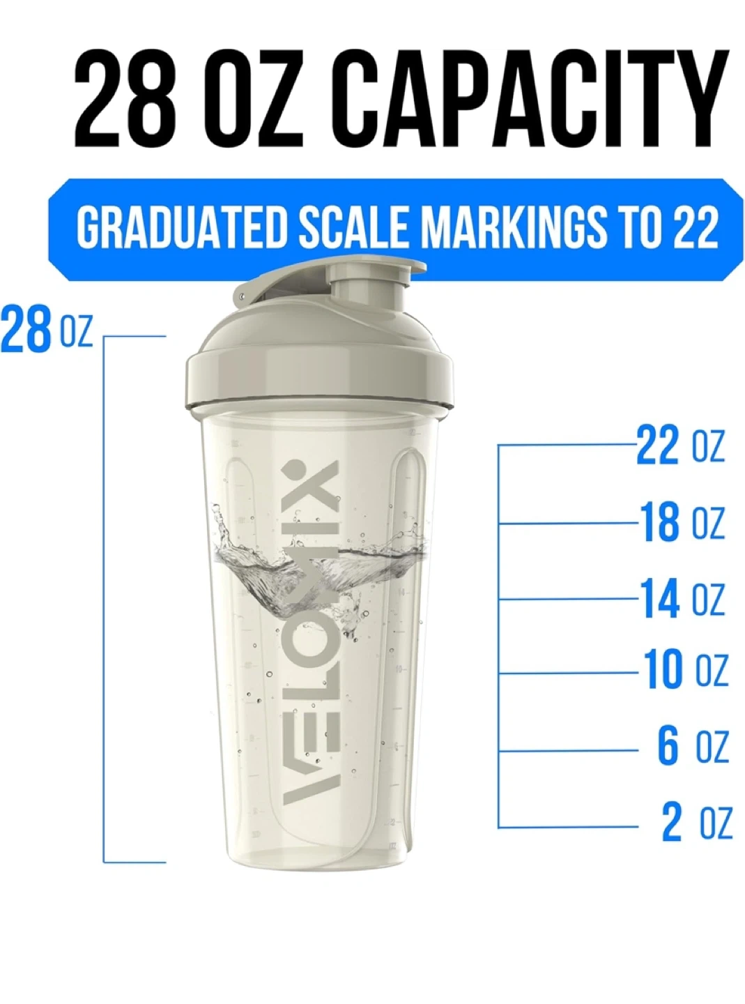 Get your protein shakes just right with this Velomix shaker cup! It holds 28 oz and has graduated scale markings up to 22 oz, so you can easily measure your liquids. Perfect for the gym or on the go!
