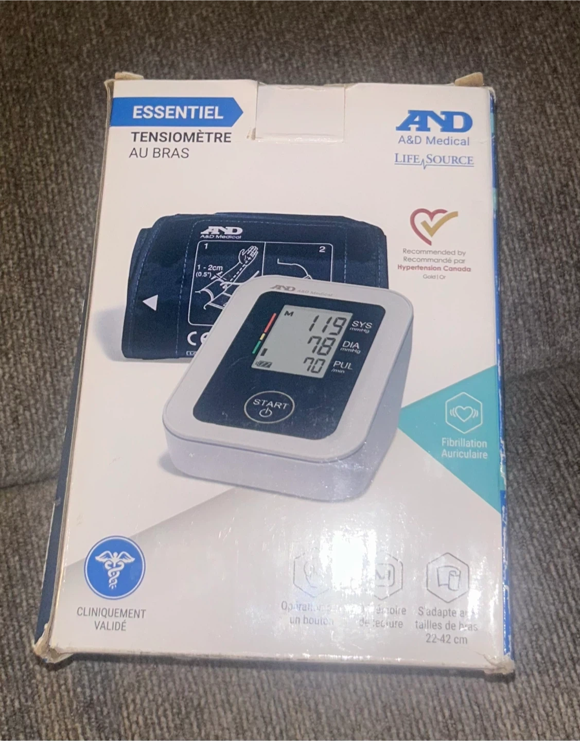 A&D Medical Essential upper arm blood pressure monitor. It features one-button operation and is recommended by Hypertension Canada. Arm cuff sizes 22-42 cm are supported.