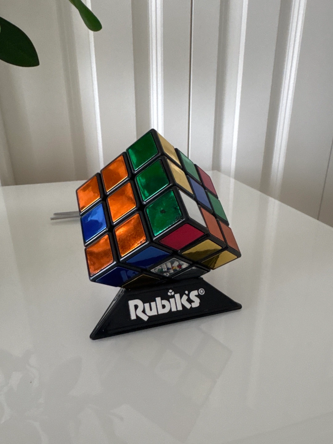 A cube-shaped puzzle. Features different coloured squares on each side. Perfect for unwinding after a long day. and it is a bright type of color!