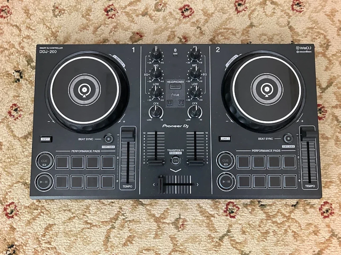 Selling a Pioneer DJ DDJ-200 Smart DJ Controller. It's in great shape and ready for a new DJ to enjoy. Perfect for beginners or experienced DJs looking for a portable setup! The WeDJ and rekordbox logos are also visible on the device.