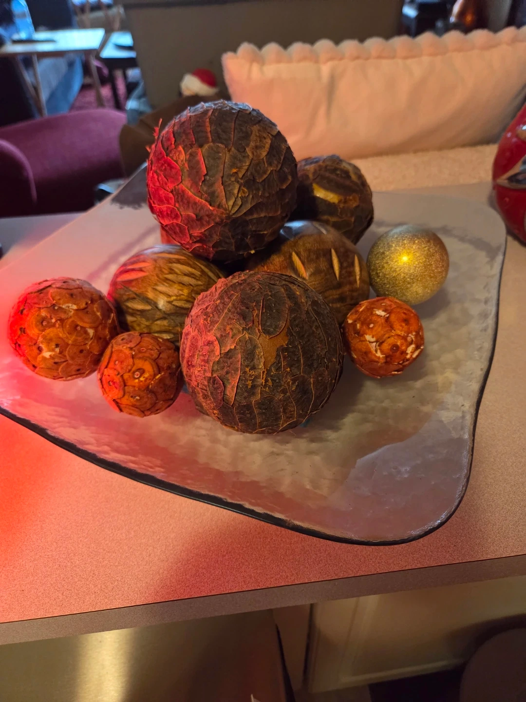 Heavy large platter. Three os the deco balls are solid wood.. No room. Platter can be used on its own. Has sturdy square base with dimple design.