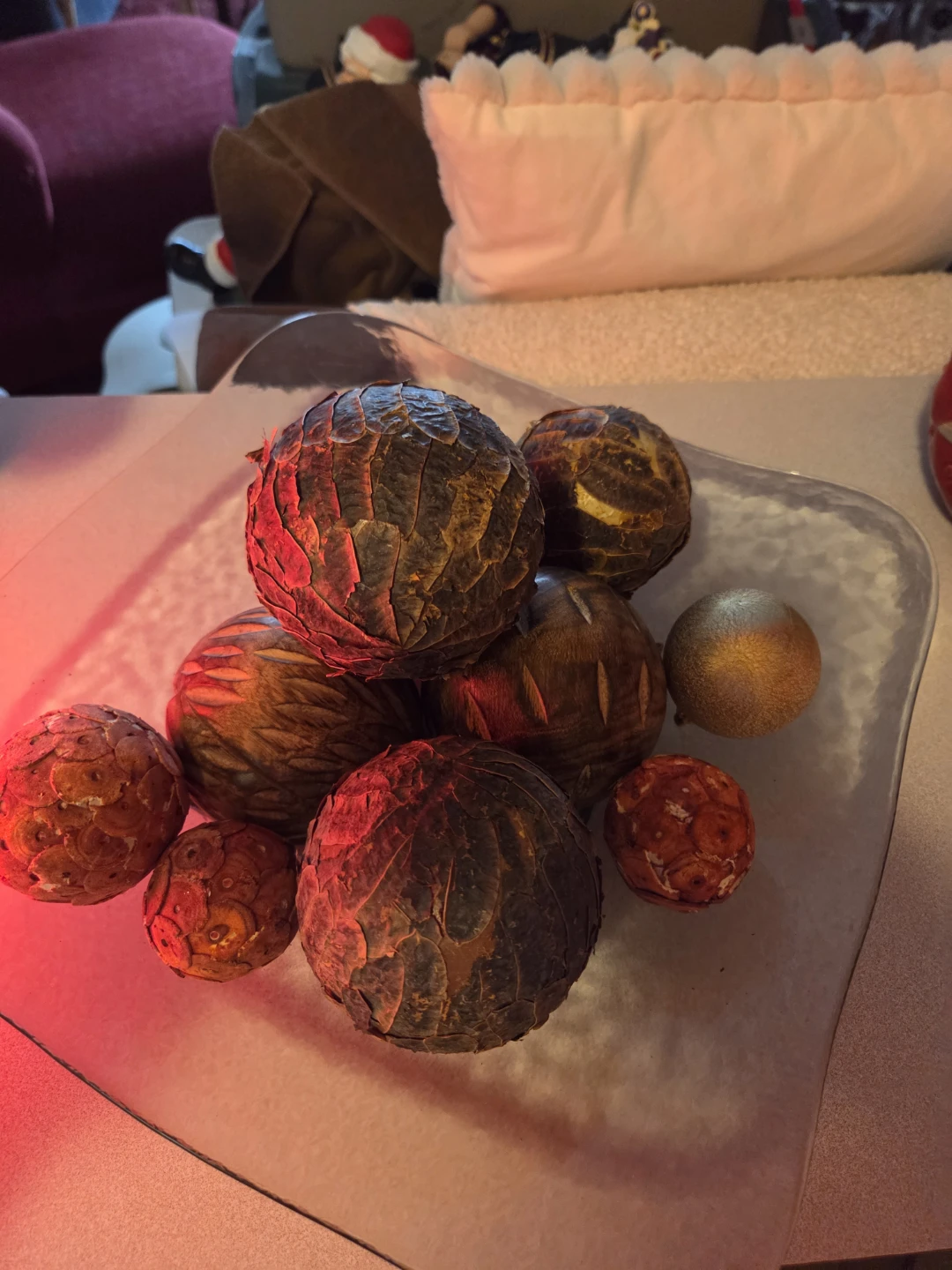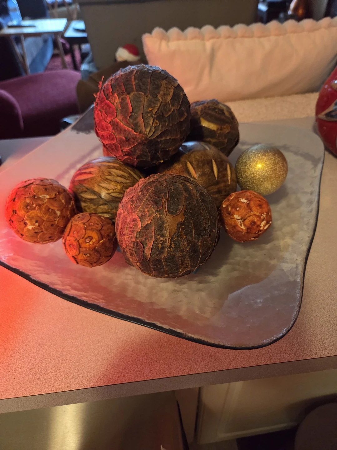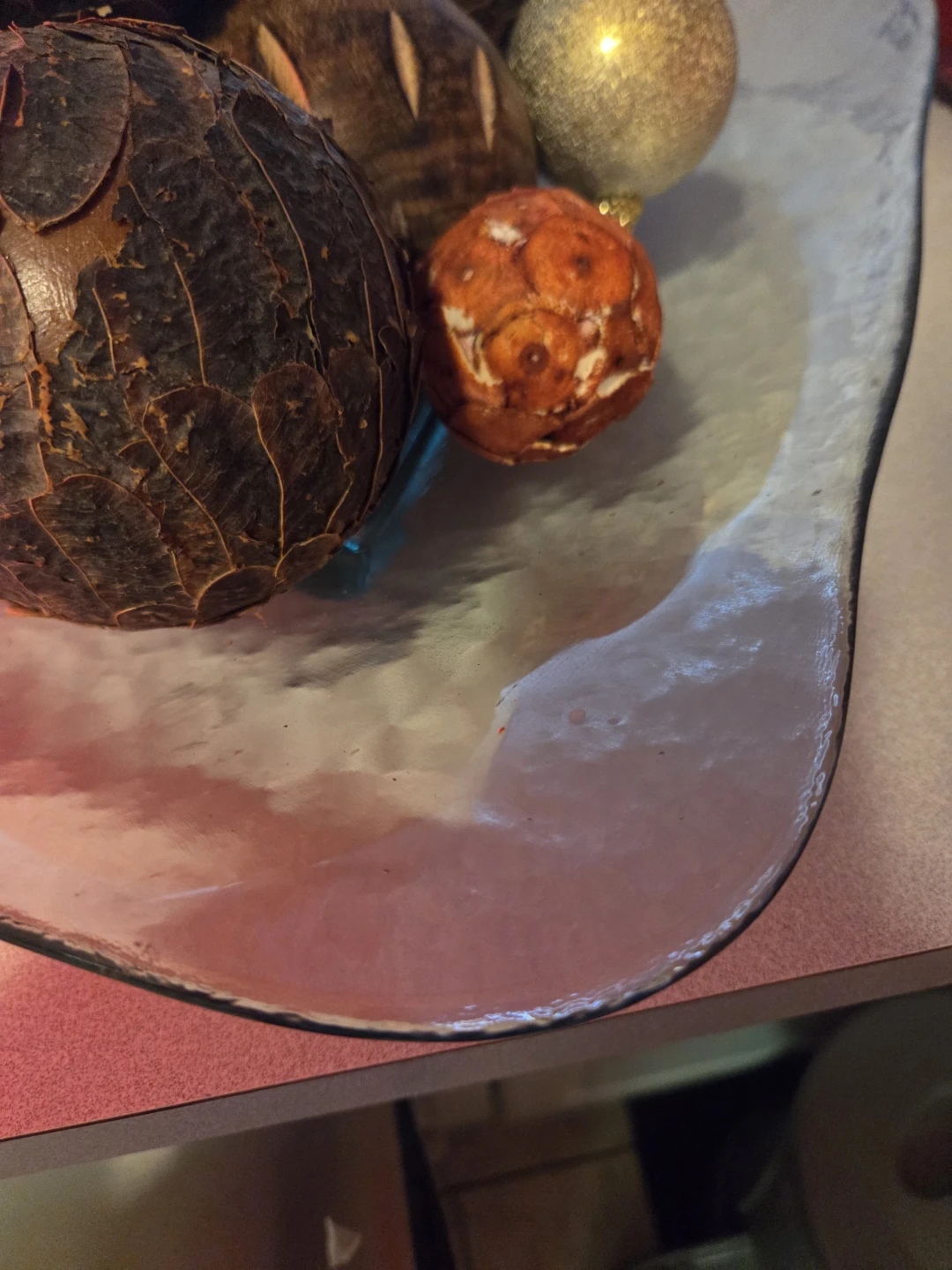 Heavy large platter. Three os the deco balls are solid wood.. No room. Platter can be used on its own. Has sturdy square base with dimple design.