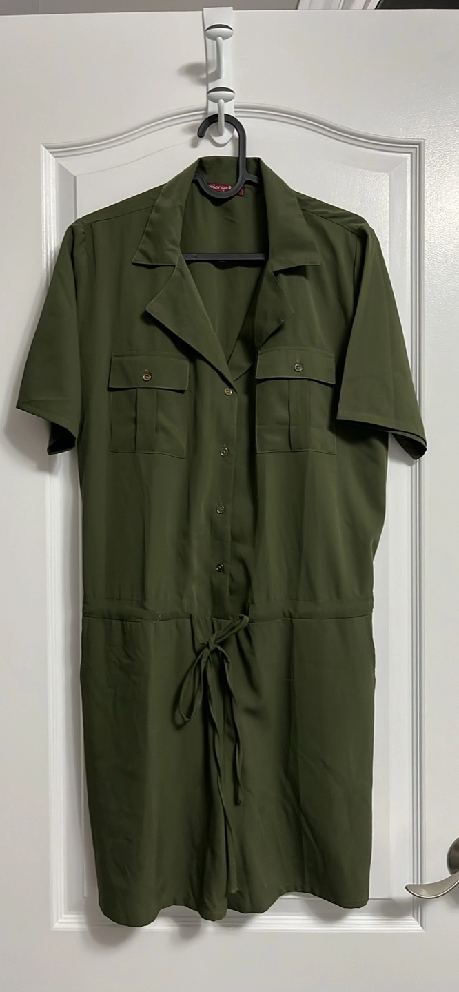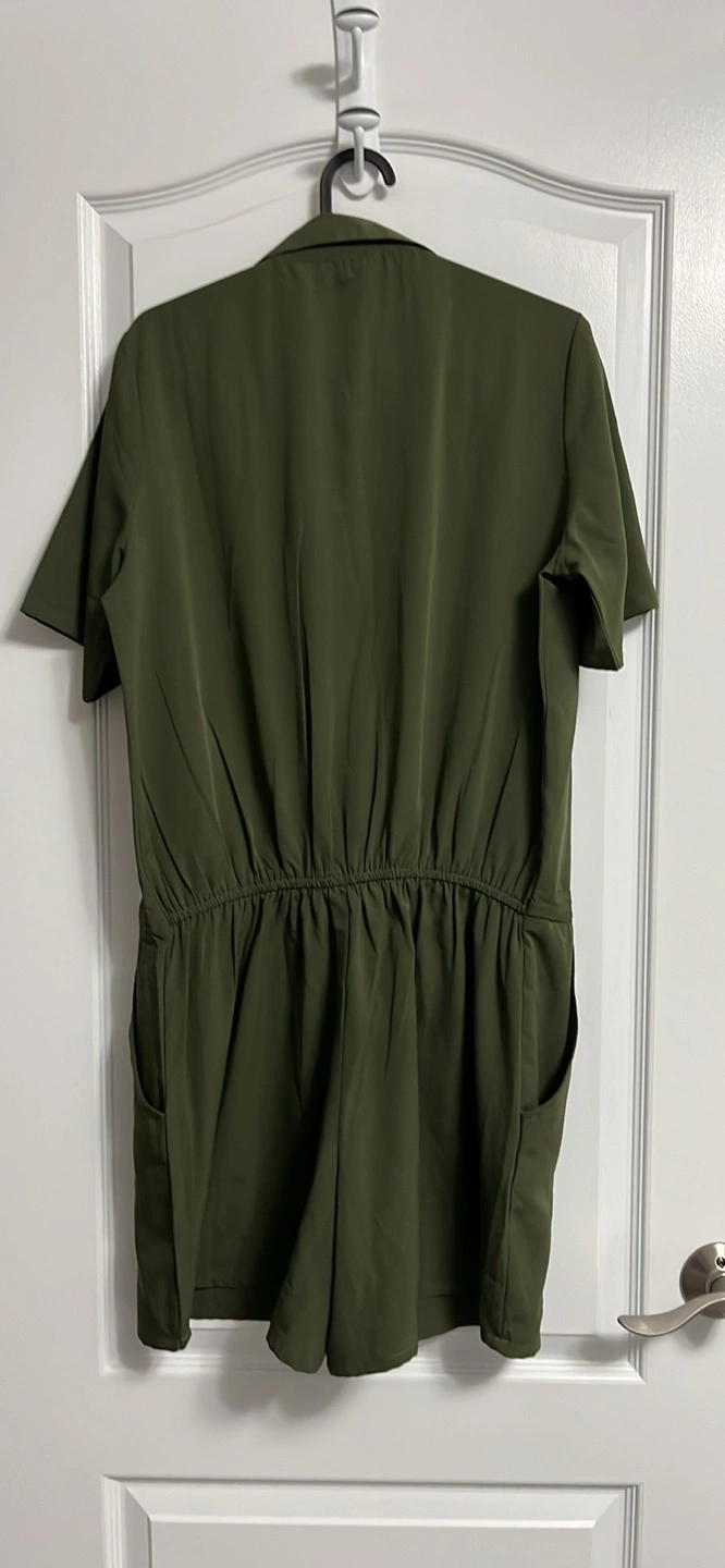 Women's olive green romper. Short sleeves, button-down front, drawstring waist, and pockets. Relaxed fit.