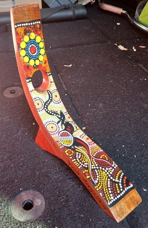 Here's a beautiful wooden wine bottle holder signe by Valilo featuring Aboriginal art! It's a unique piece that would look great in any home. The holder is in good condition and ready to be enjoyed