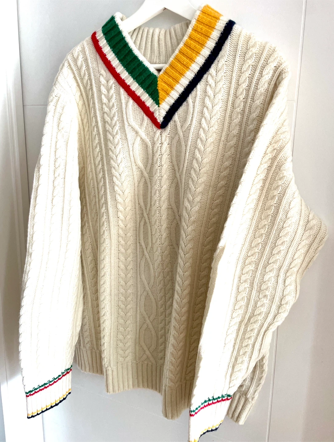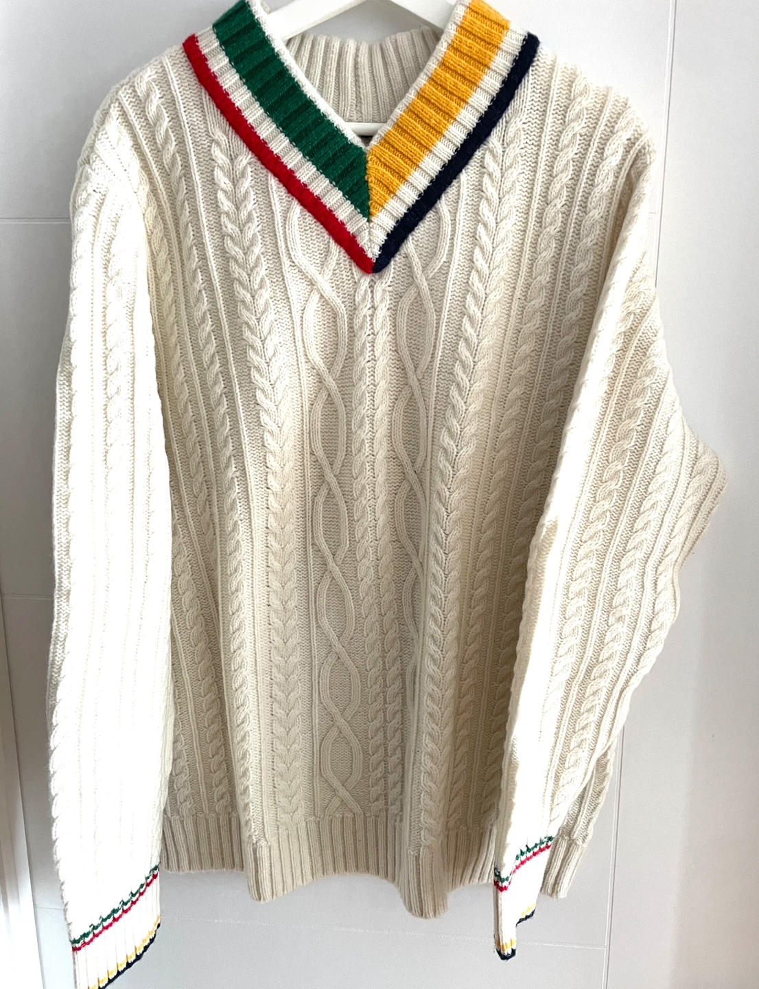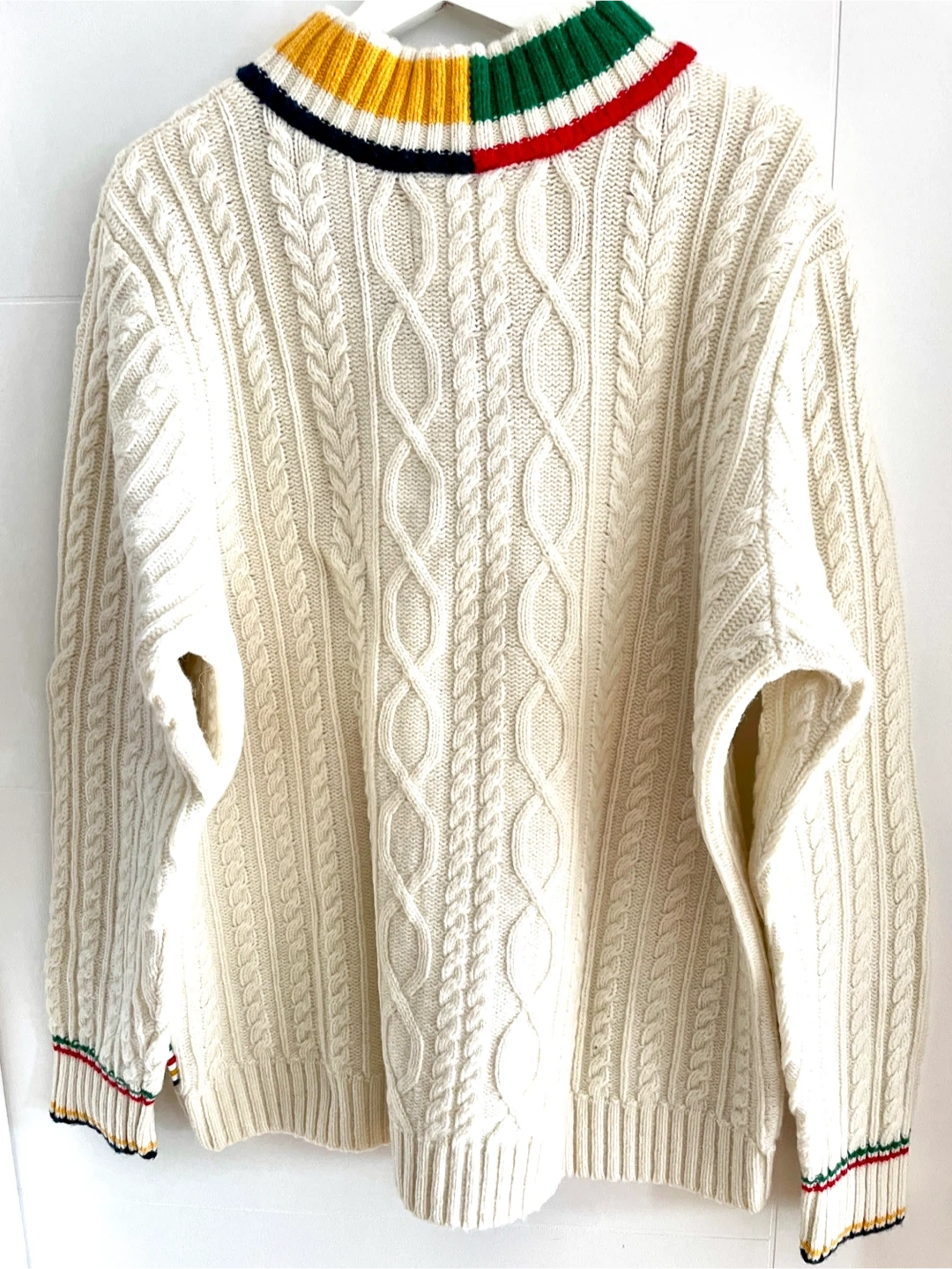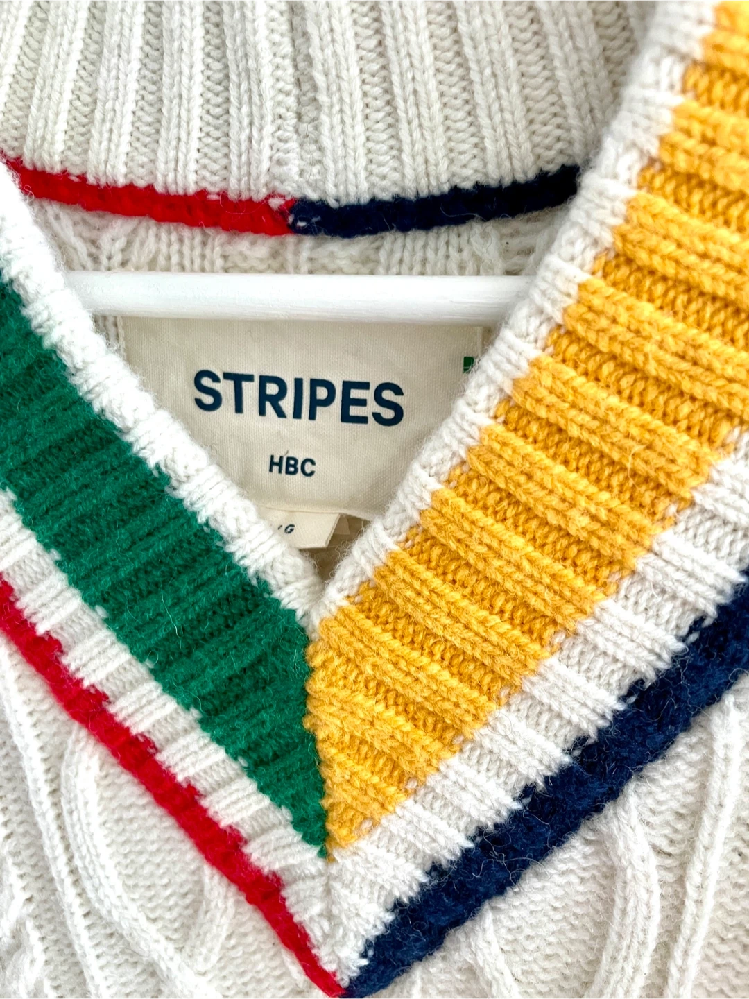 Selling a HBC Stripes men's wool-blend varsity cable v-neck sweater of the Canadian iconic HBC Stripes by Hudson’s Bay.