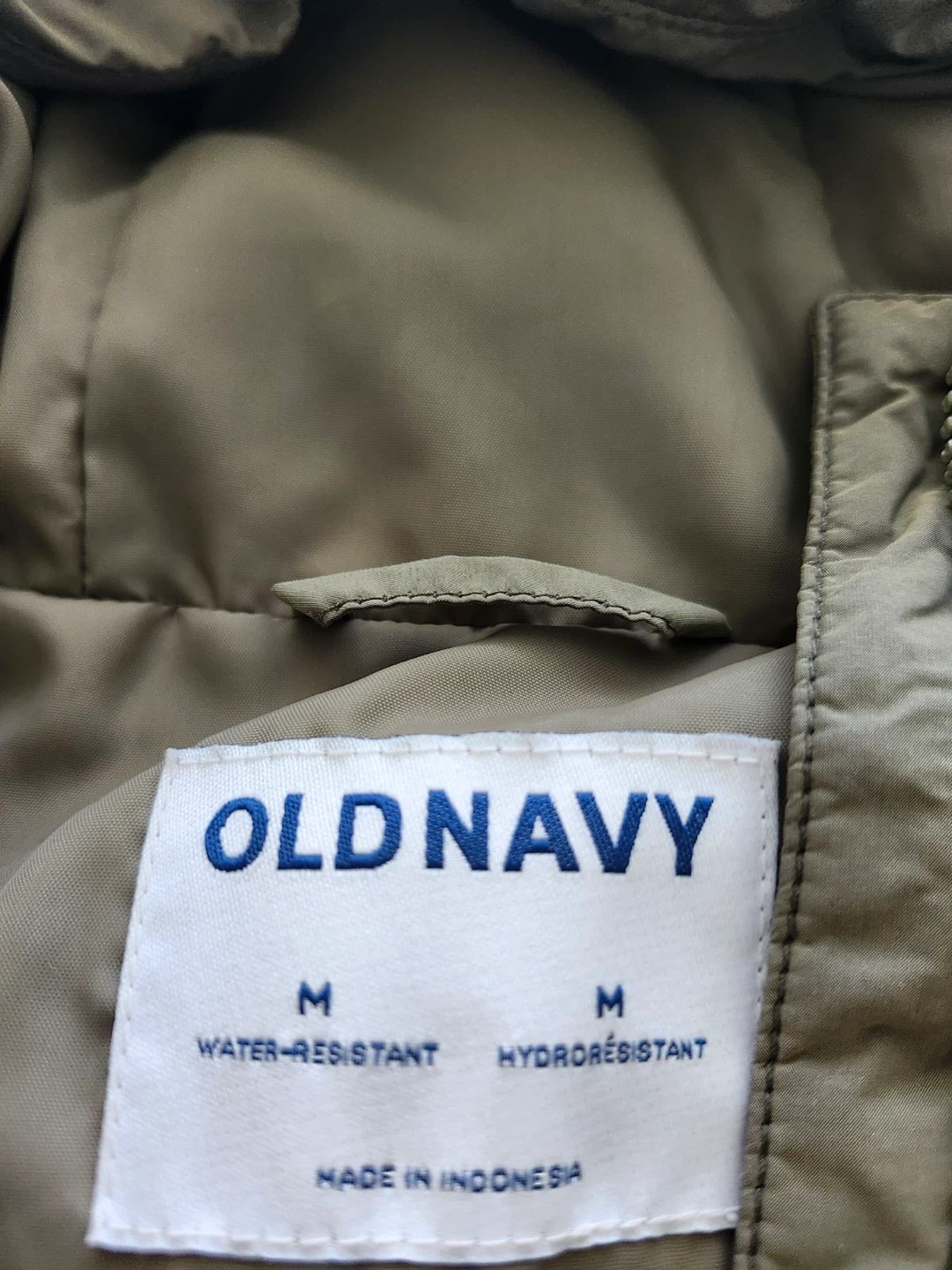 Water-resistant puffer jacket from Old Navy. It's a size medium and made in Indonesia. This jacket's got a hooded design to keep you cozy! It's great for staying dry on drizzly days.