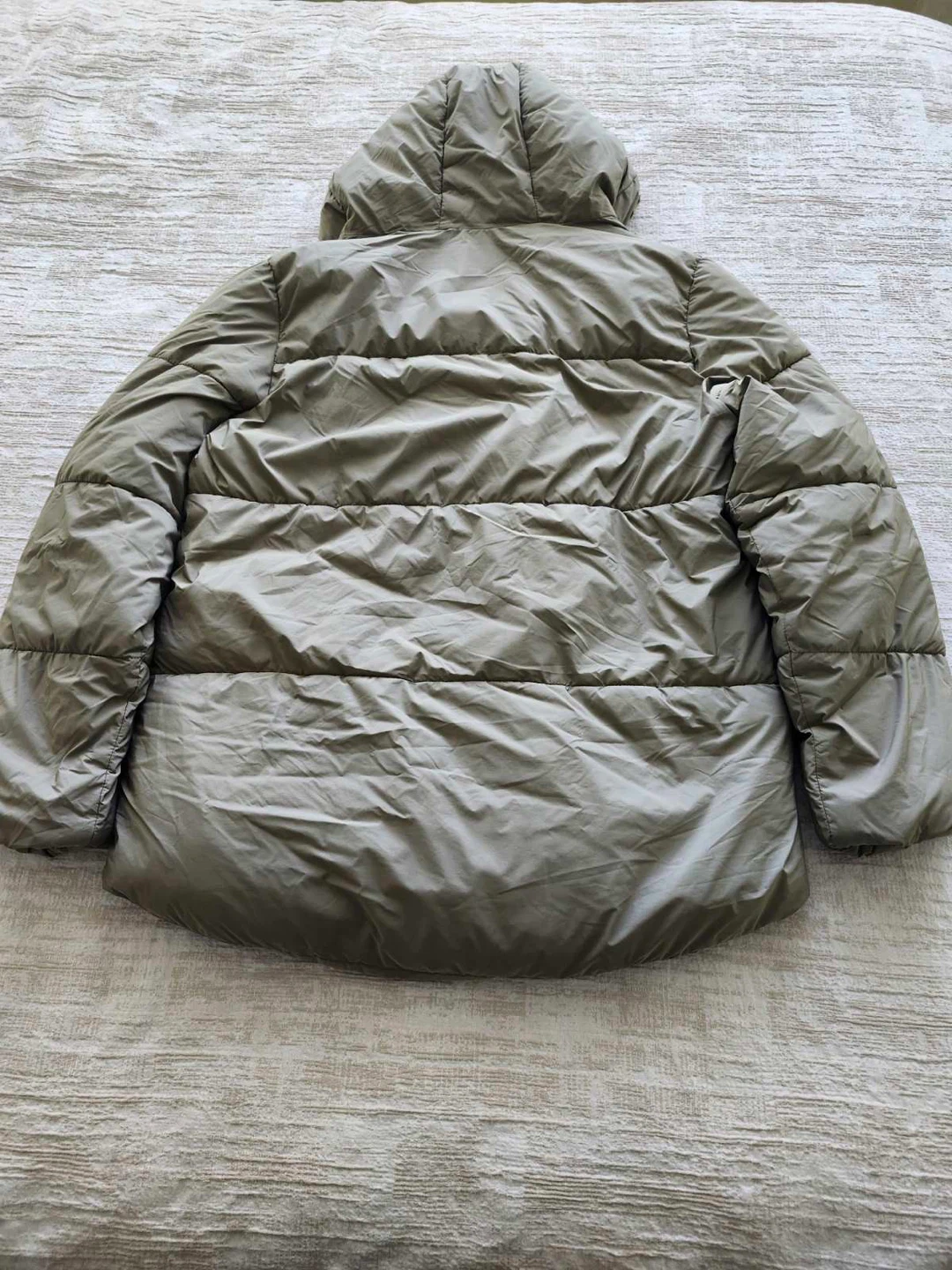 Water-resistant puffer jacket from Old Navy. It's a size medium and made in Indonesia. This jacket's got a hooded design to keep you cozy! It's great for staying dry on drizzly days.