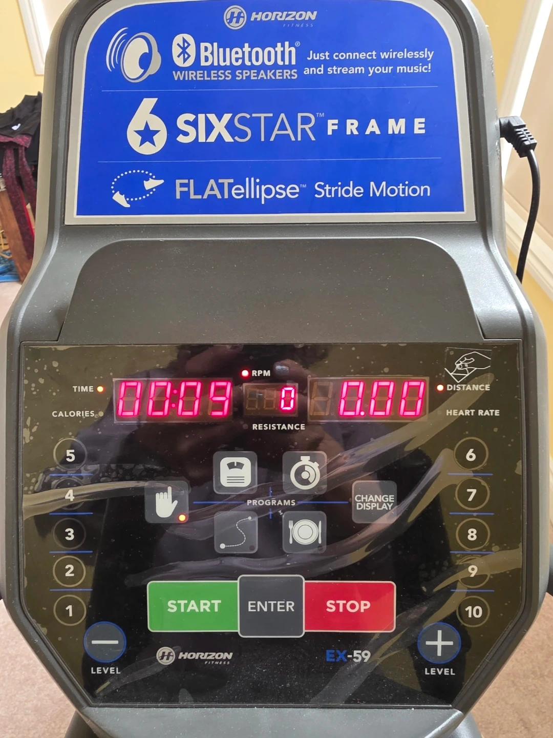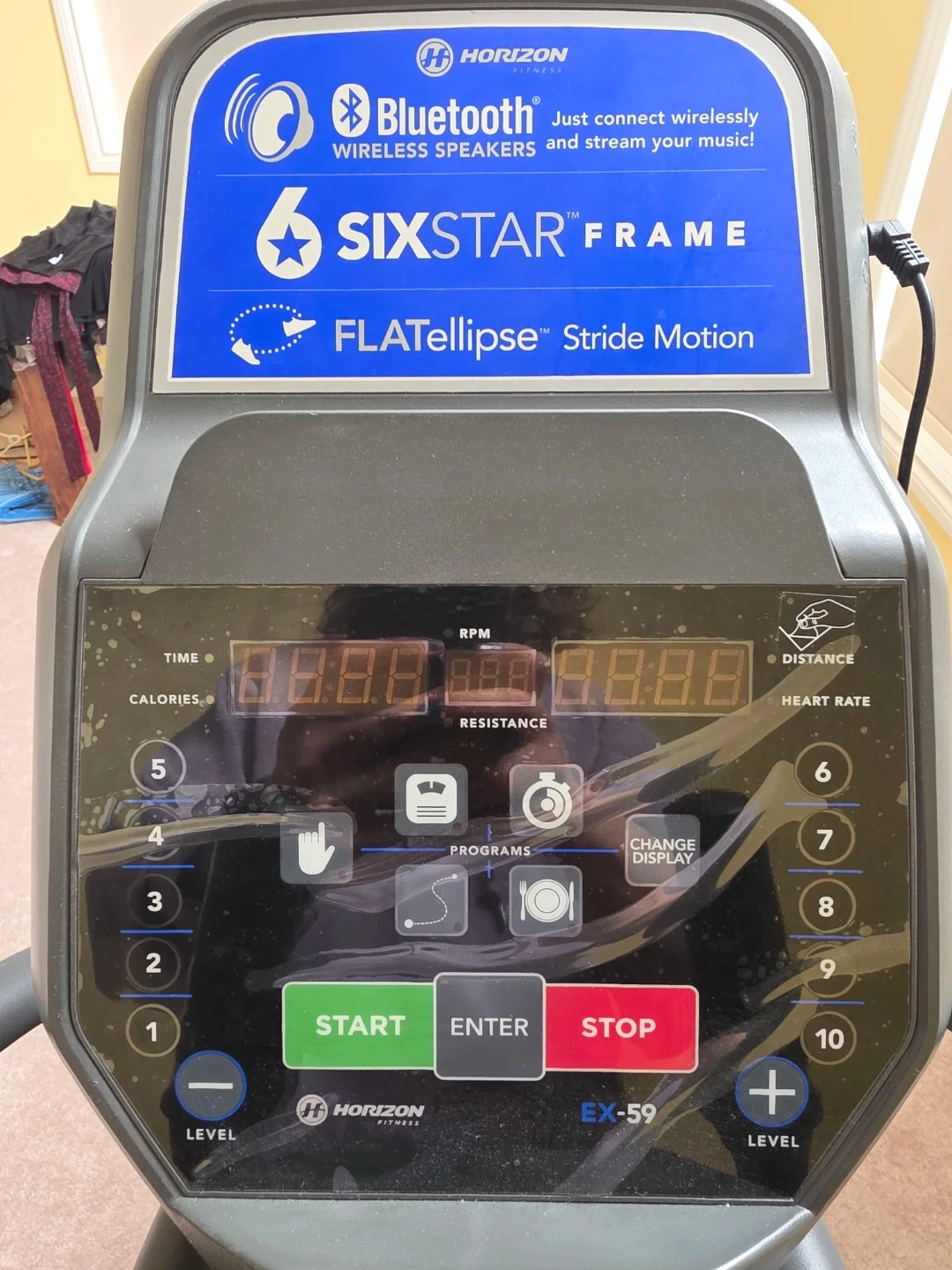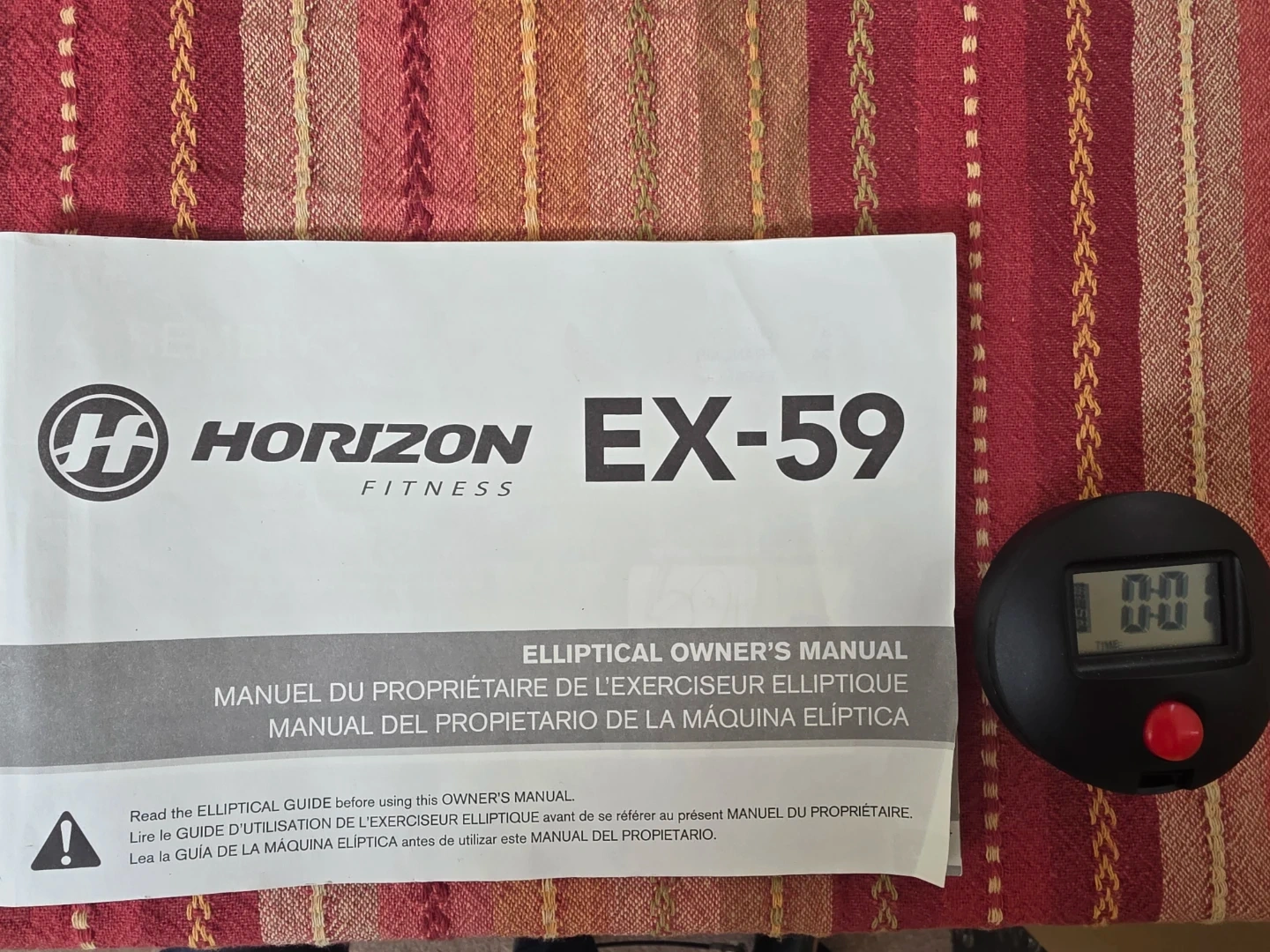Horizon Fitness EX-59 elliptical. This machine offers Bluetooth wireless speakers and FLATTellipse stride motion. It's designed for home workouts. Includes the owner's manual.