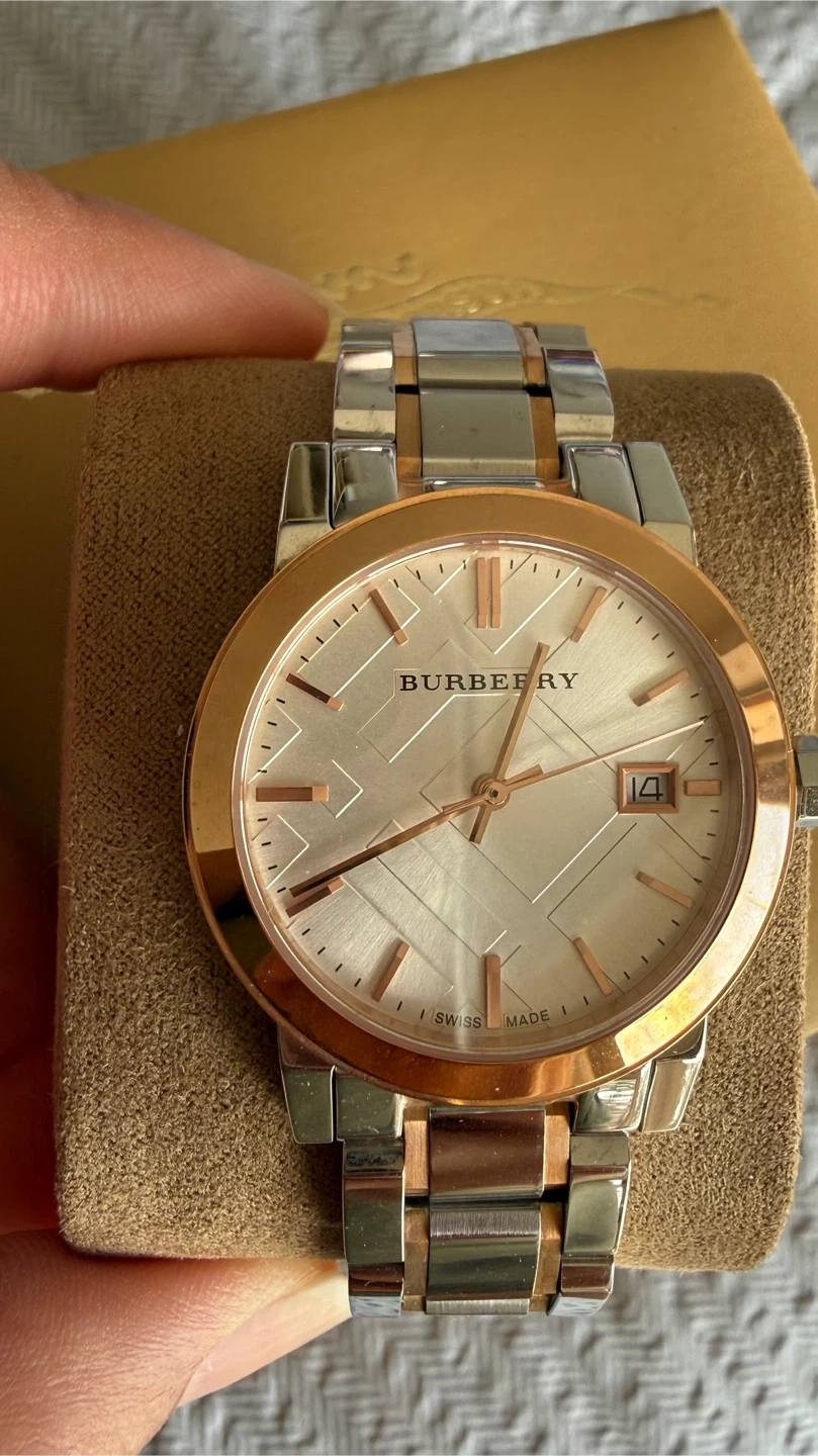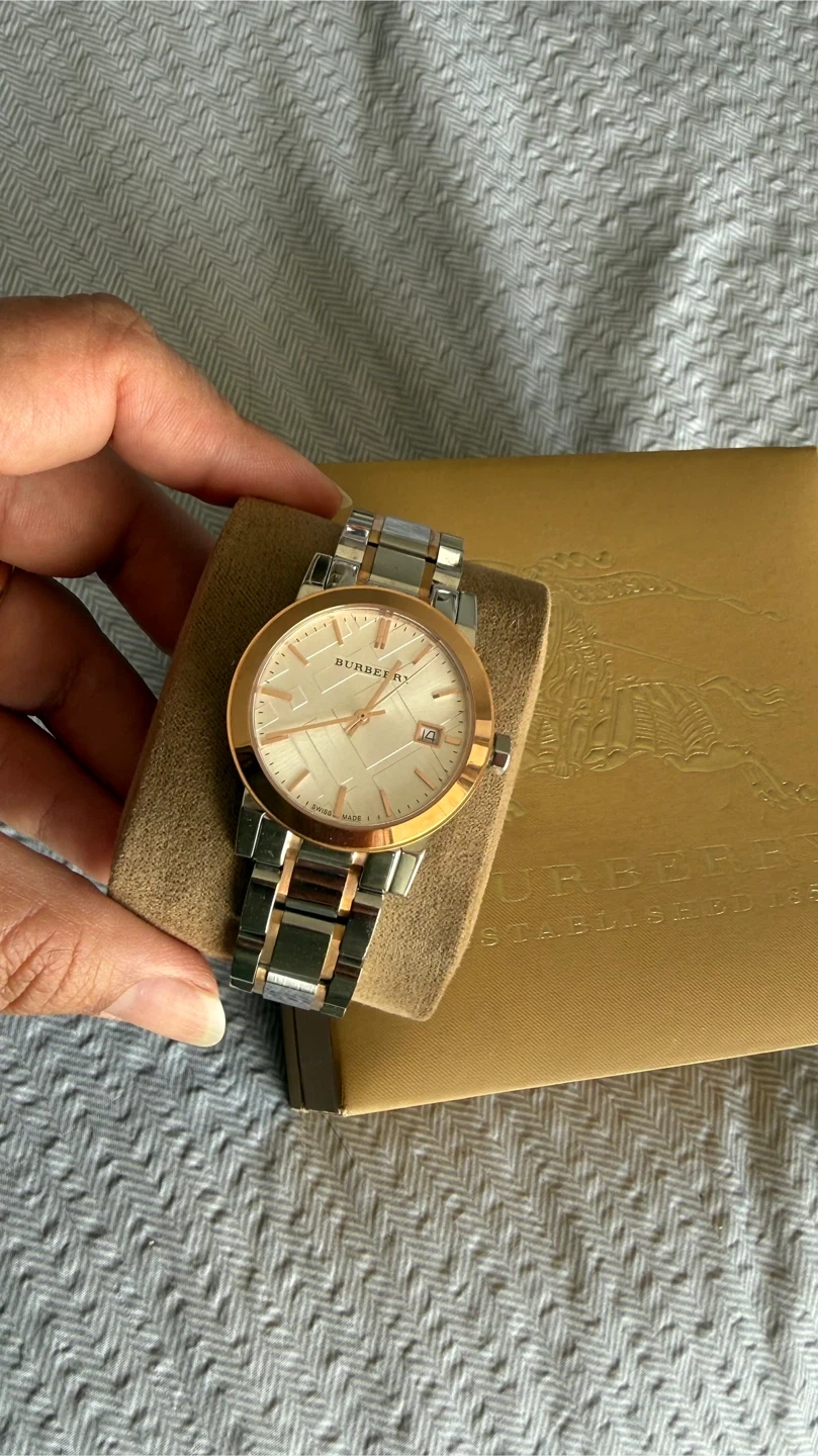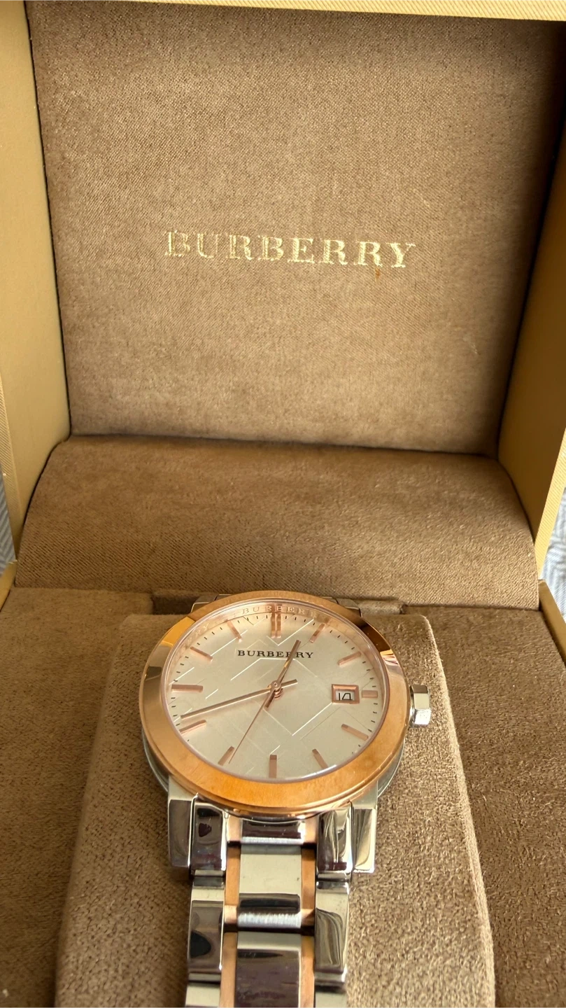 This is a Burberry watch with a two-tone stainless steel band and rose gold accents. It features a date window and a classic dial design. Comes with the original box.