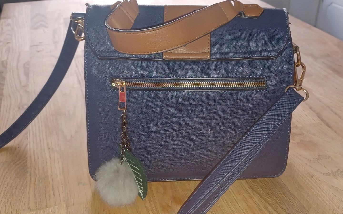 A stylish navy blue and brown shoulder bag! It features a cute pompom and leaf keychain. The inside has a striped pattern. Perfect for adding a touch of elegance to any outfit