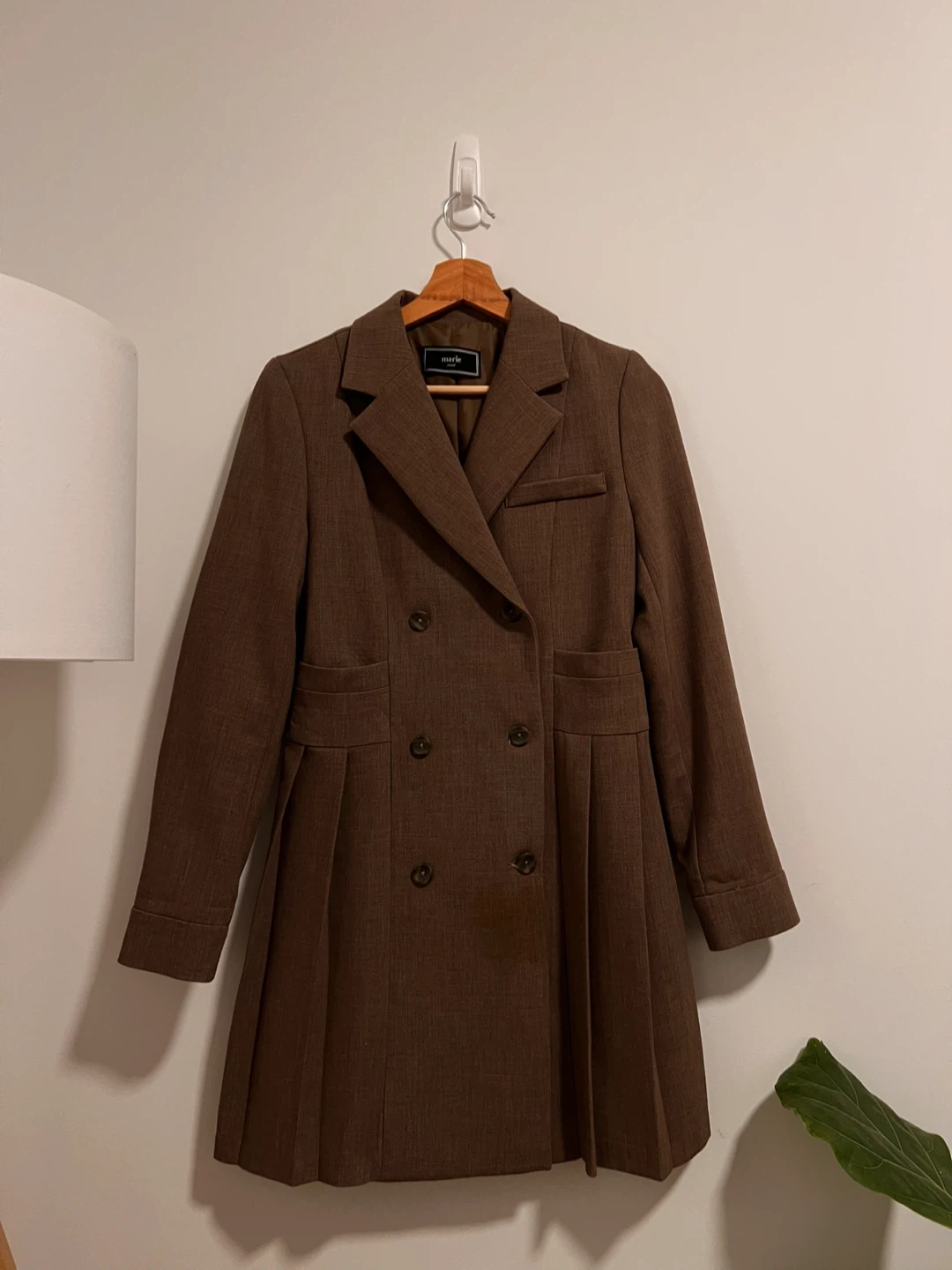 This is a stylish brown dress coat from Korea. It features a double-breasted design and a pleated skirt. Perfect for adding a touch of sophistication to any outfit!
