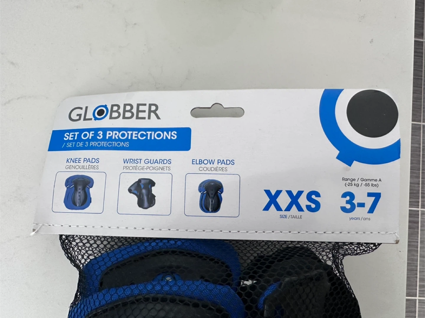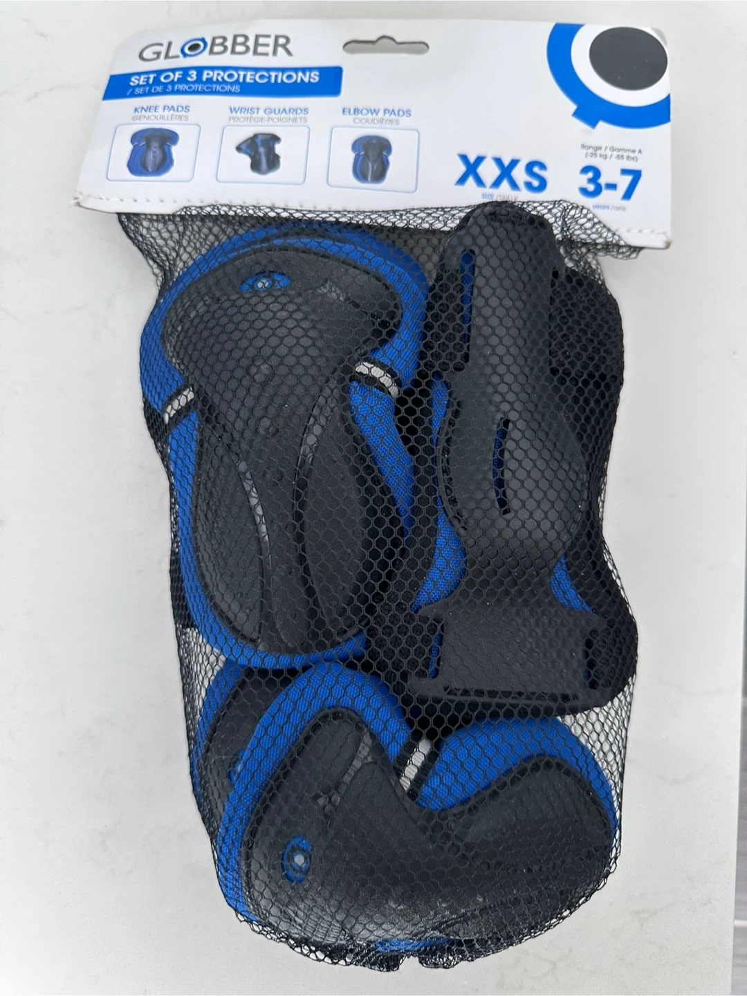 Brand new kids Globber set of 3 protections, including knee pads, wrist guards, and elbow pads. This set is size XXS, suitable for ages 3-7 years (25 kg / 55 lbs). It comes in a mesh bag for easy storage.