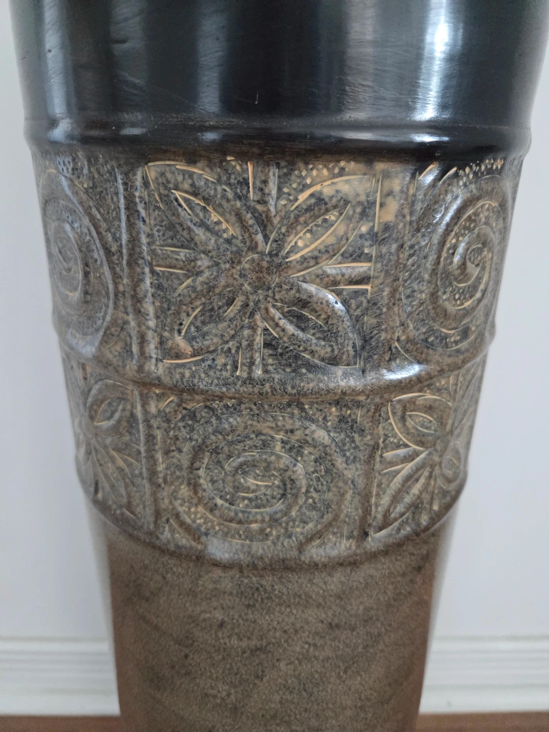 This is a tall decorative vase with a black glossy top and a textured bottom. It features an embossed band with intricate floral and swirling patterns. A statement piece for any room!