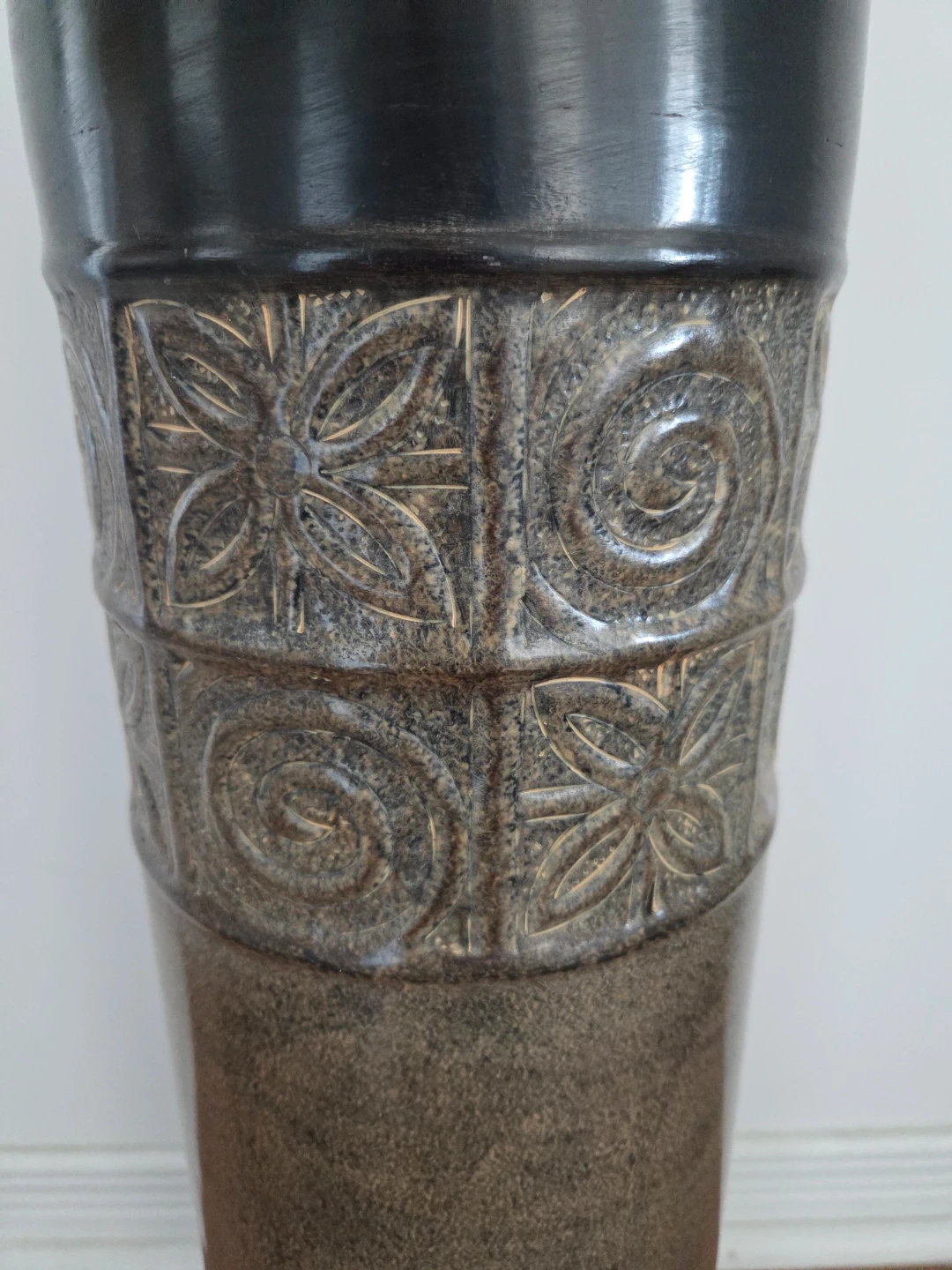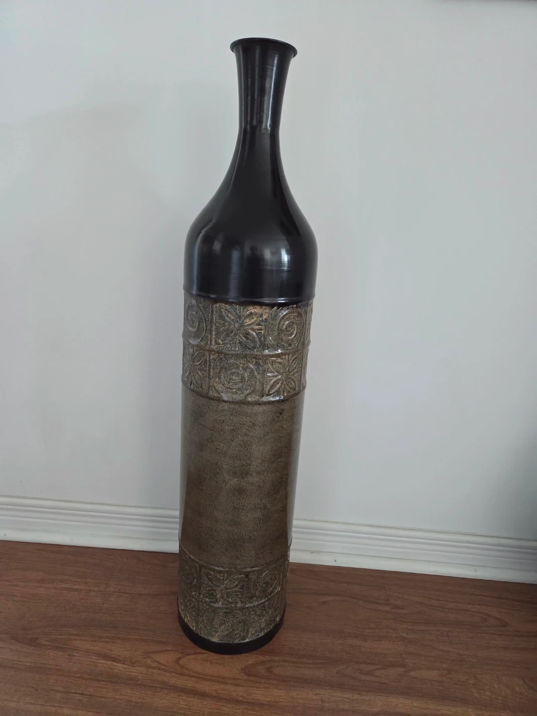 This is a tall decorative vase with a black glossy top and a textured bottom. It features an embossed band with intricate floral and swirling patterns. A statement piece for any room!
