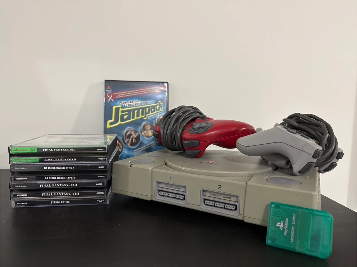This bundle includes a PlayStation 1 console, two controllers, and several games. It comes with Final Fantasy VII (3 discs), Final Fantasy VIII (4 discs), Ridge Racer Type 4 (2 discs), and Syphon Filter. A green memory card is also included. It's a great deal for any retro gaming fan!