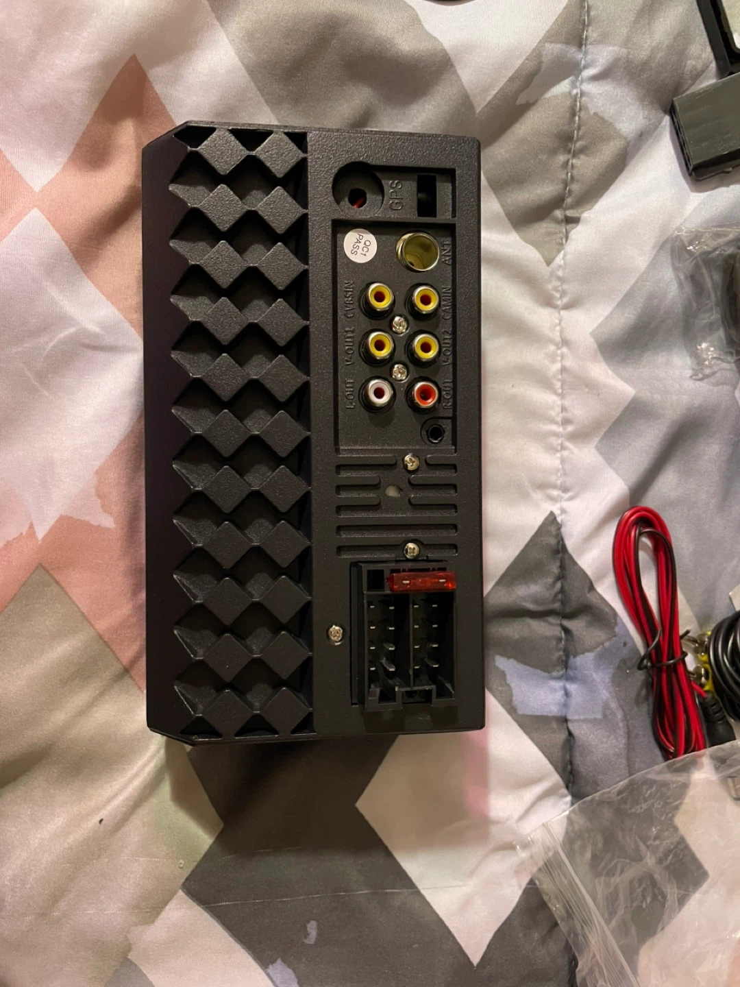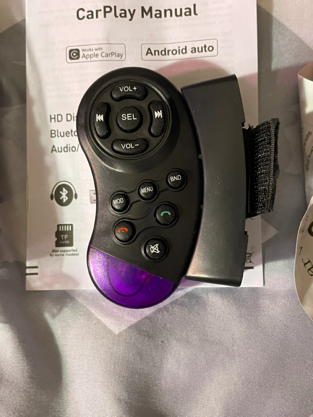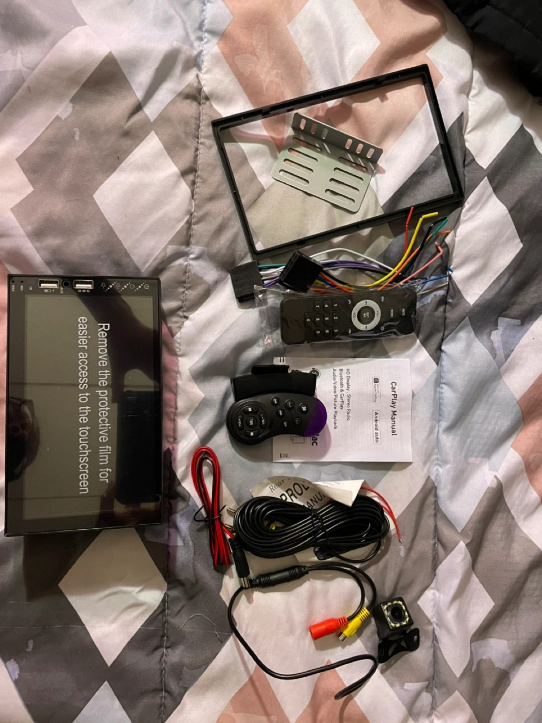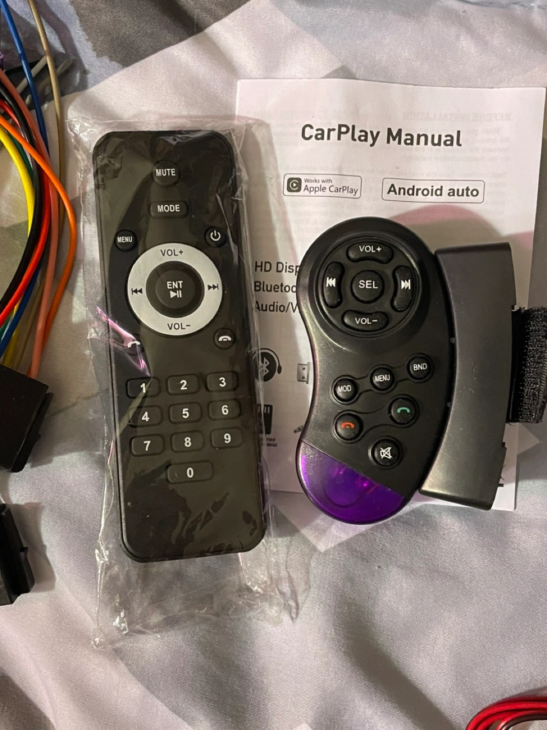 This is a car stereo receiver that works with Apple CarPlay and Android Auto. It features HD Display, Bluetooth, and Audio/Video input. Includes a remote control and wiring harness.