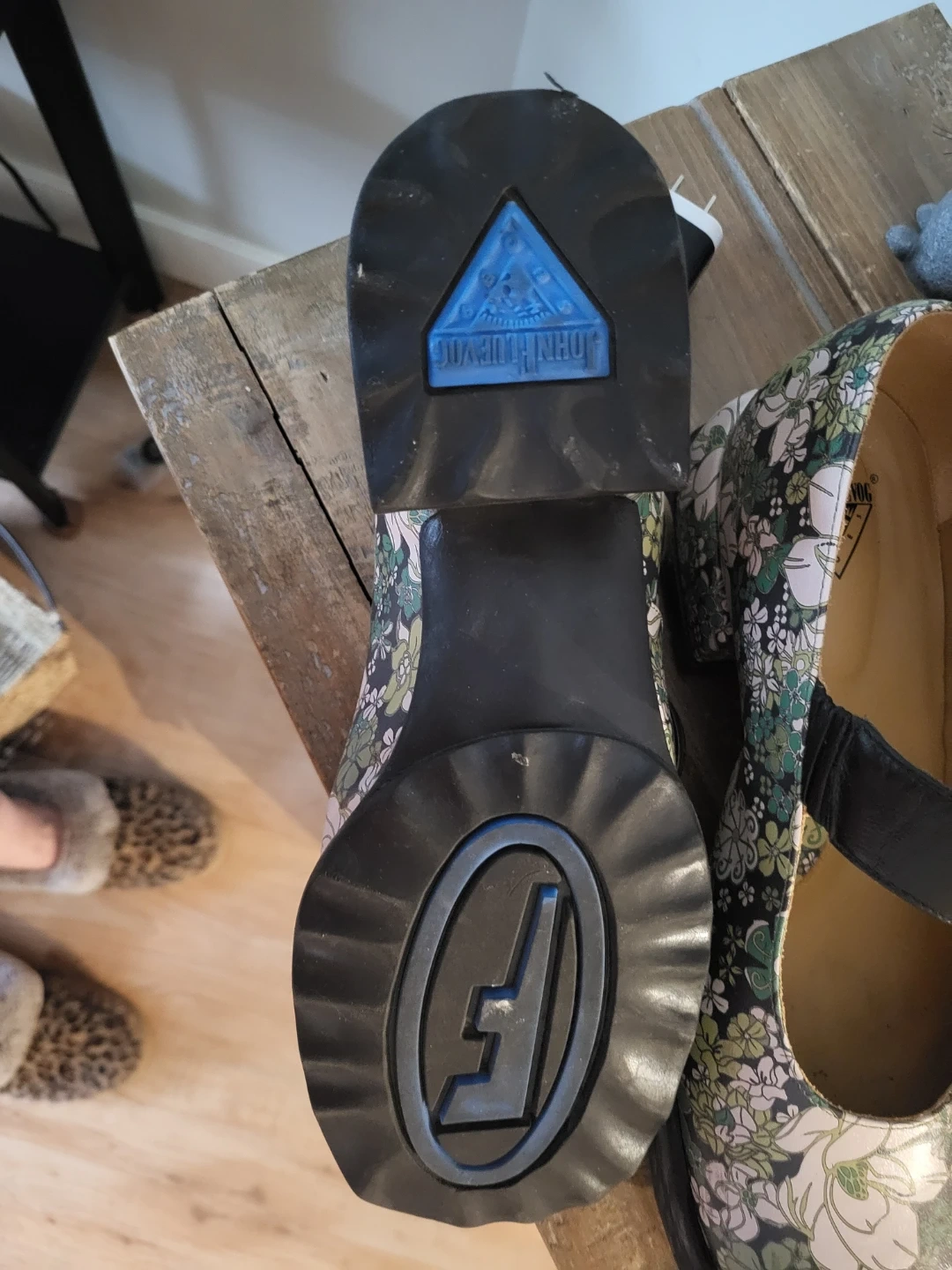 These John Fluevog Mary Janes feature a black and green floral print with black leather straps and gold-tone hardware. They have a chunky platform sole. Great for adding a unique touch to an outfit! They have only been worn a couple of times, I bought them a size too small by mistake. They are a women's size 8. An amazing shoe that will last