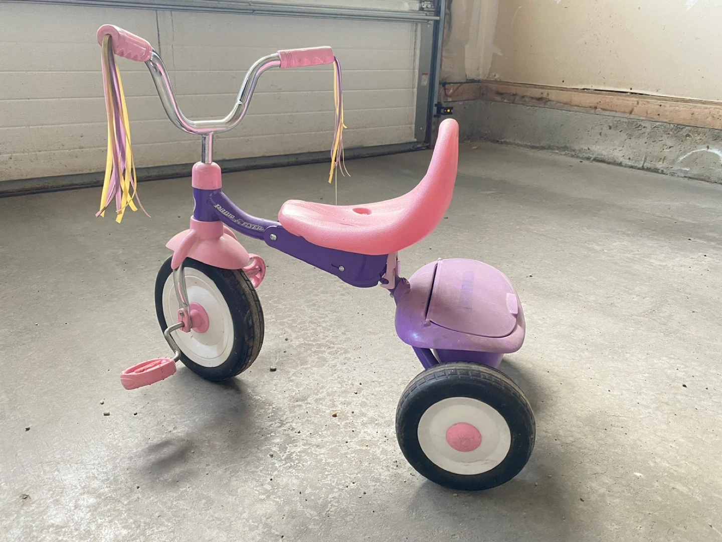 Radio Flyer tricycle with pink seat and handlebars. It's purple and pink, with streamers on the handlebars. It has a storage compartment at the back. Great for little ones learning to pedal!