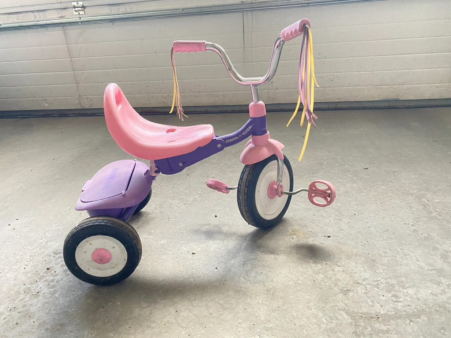 Radio Flyer tricycle with pink seat and handlebars. It's purple and pink, with streamers on the handlebars. It has a storage compartment at the back. Great for little ones learning to pedal!