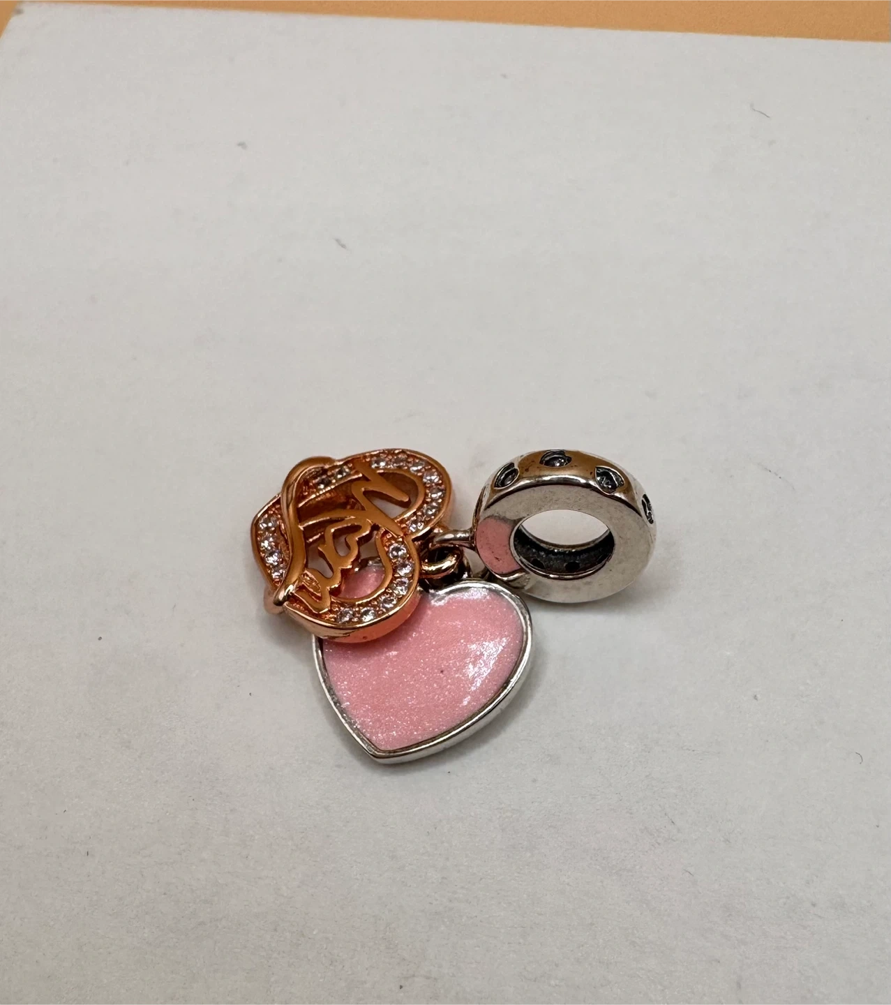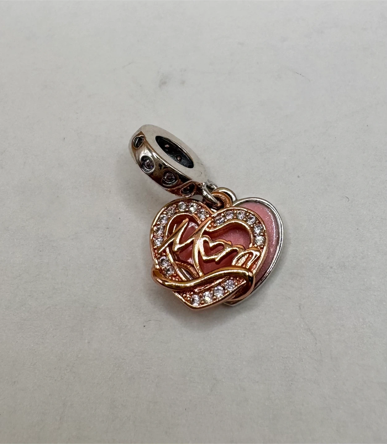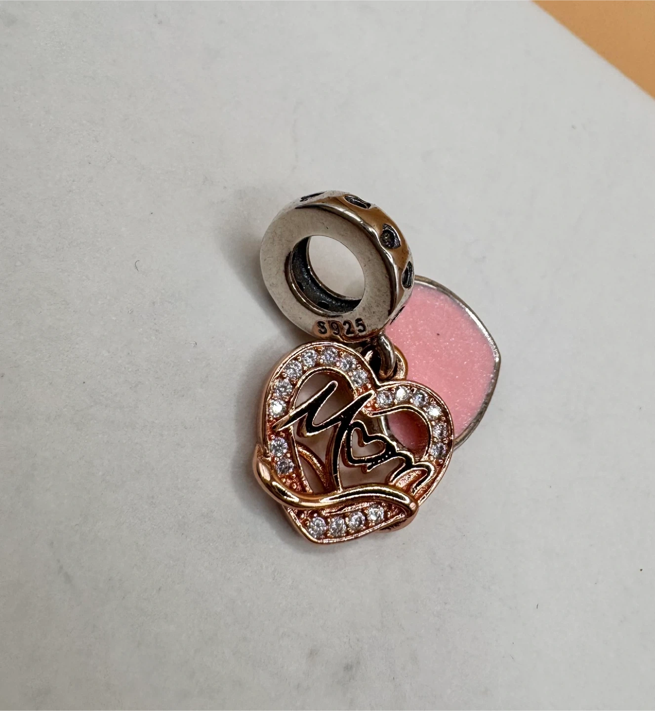 This is a charm pendant with a heart design and the word 'Mom' inscribed. It's adorned with sparkling stones and has a pink enamel finish. The bail is marked S925. It's a lovely piece for Mother's Day or any occasion to show appreciation.