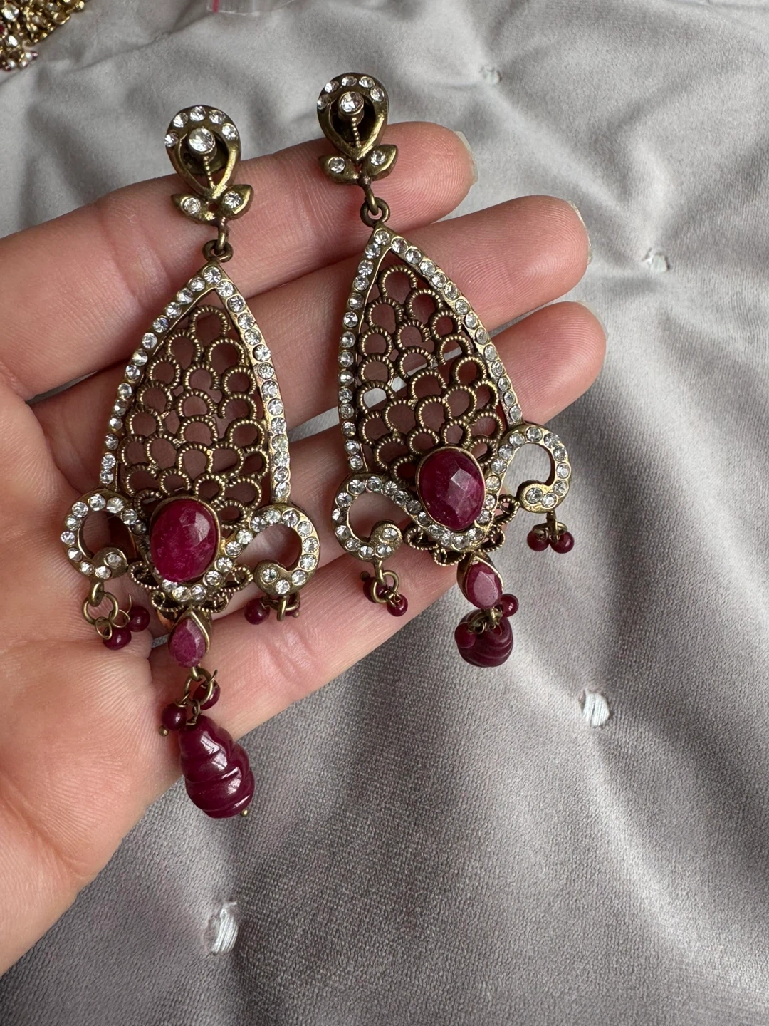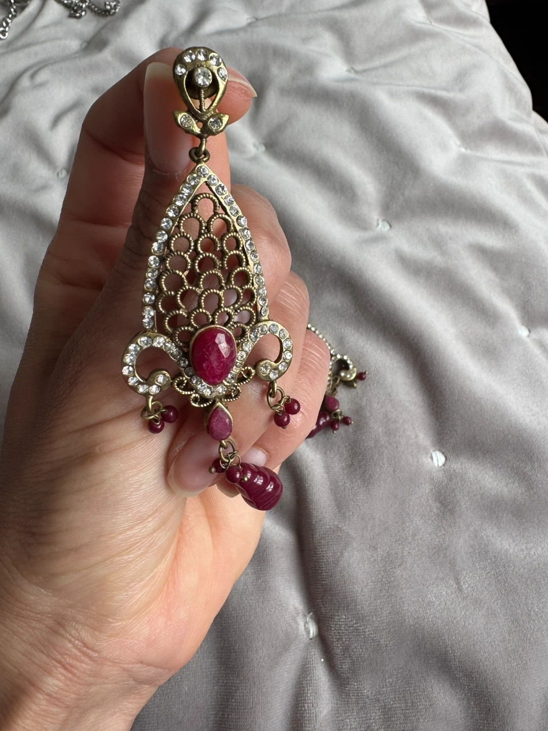 These eye-catching dangle earrings feature an ornate gold-tone metalwork design. They're accented with small clear crystals and a larger red stone at the centre, with dangling red beads below. It's a striking pair of statement earrings!