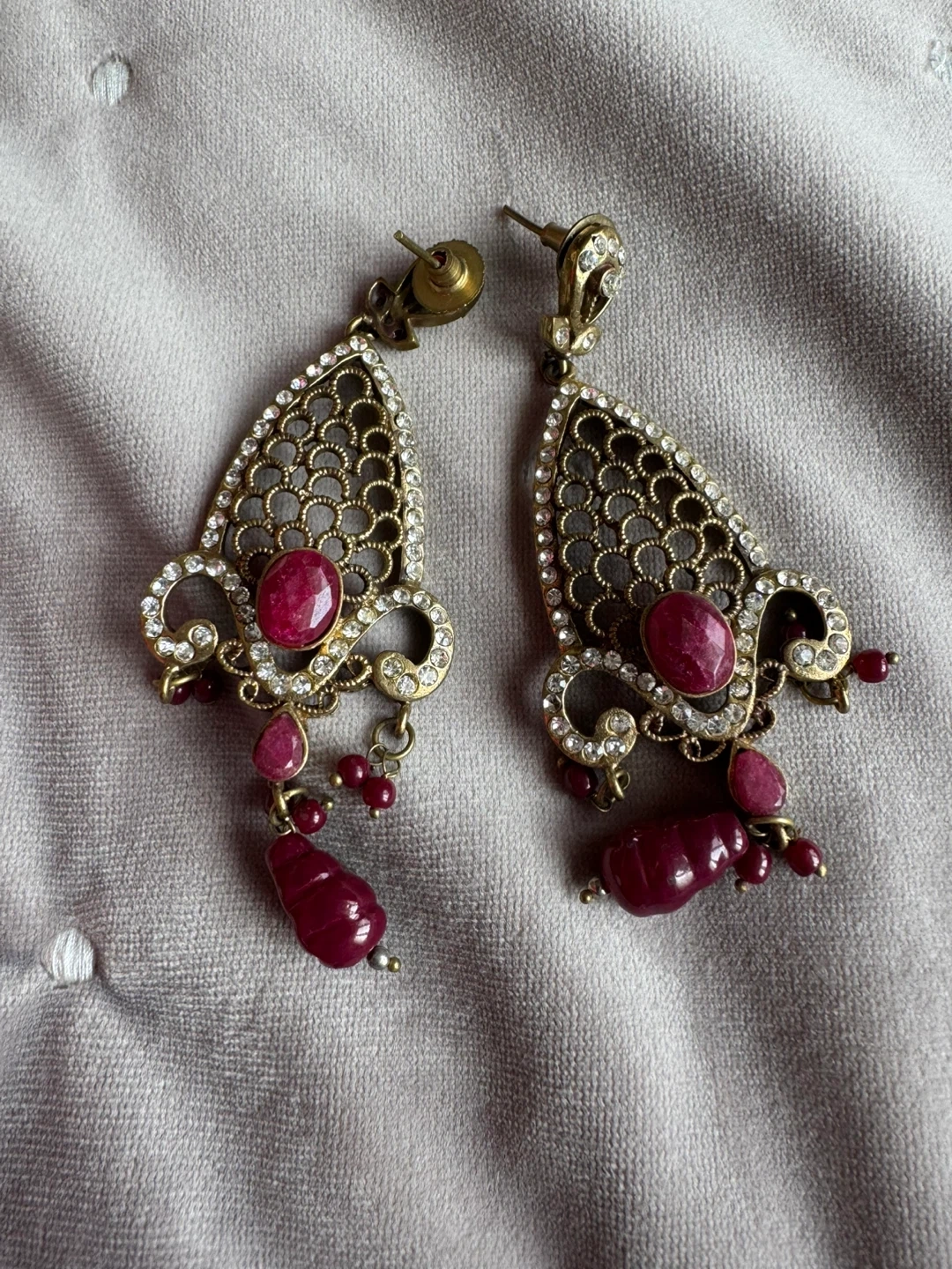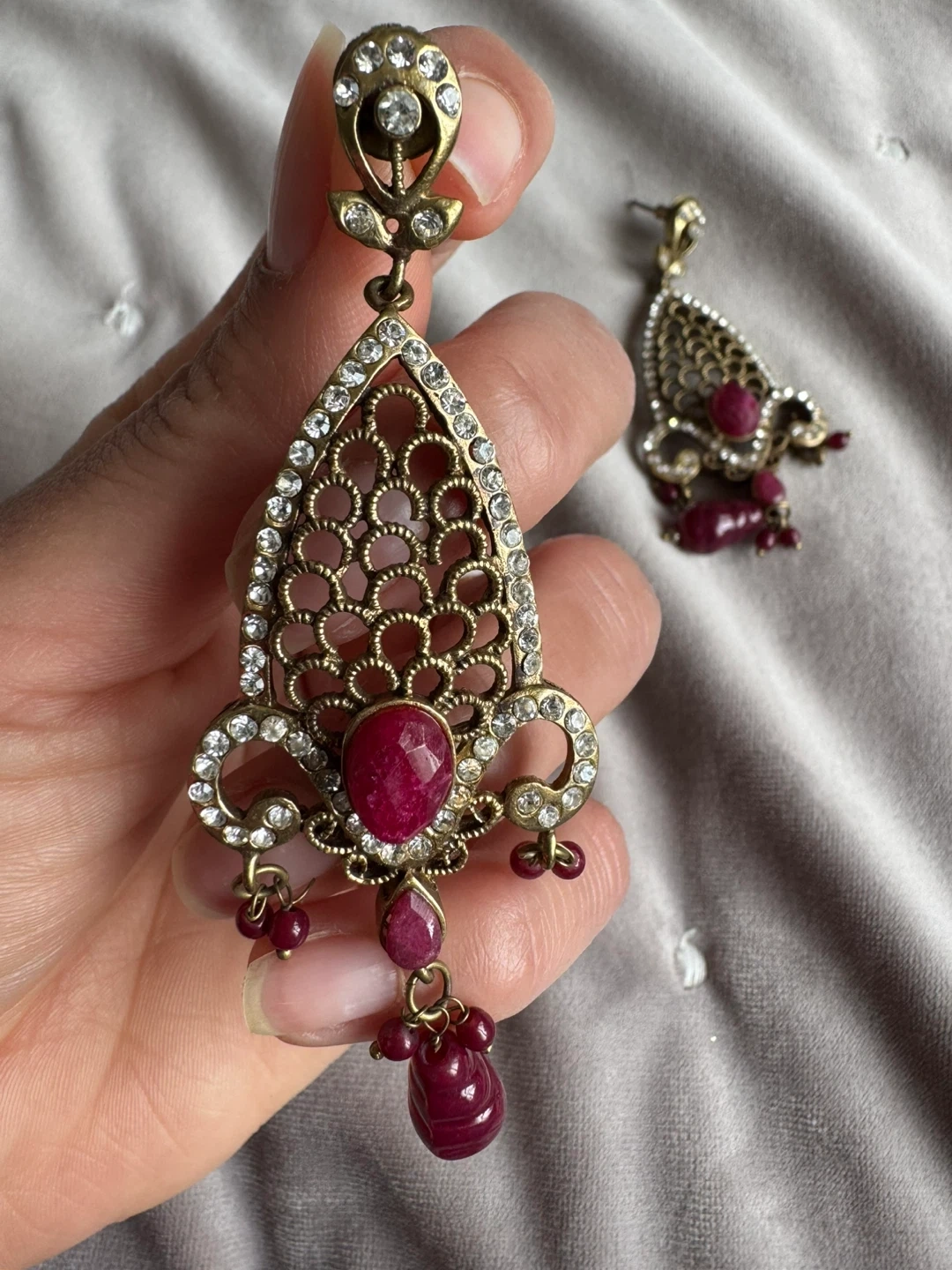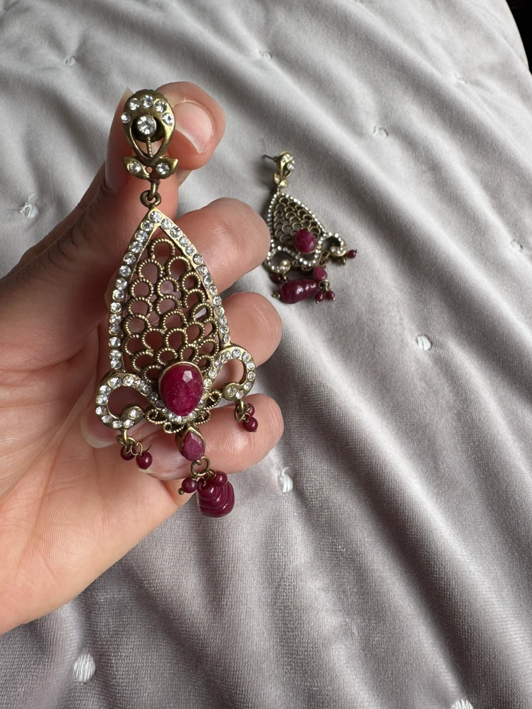 These eye-catching dangle earrings feature an ornate gold-tone metalwork design. They're accented with small clear crystals and a larger red stone at the centre, with dangling red beads below. It's a striking pair of statement earrings!