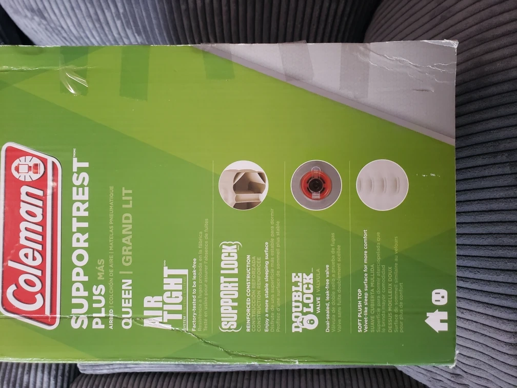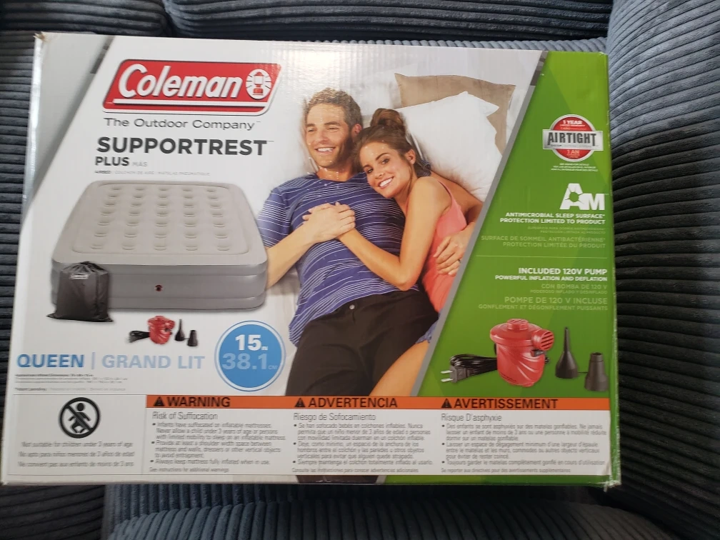 Selling a brand new Coleman SupportRest Plus Queen air mattress! It's still in its original packaging and has never been used. I originally bought it for 113$ after taxes. Bought it thinking my bed mattress would not come on time for my move due to the Postal Services going on strike, but my bed mattress did show up on time. Need to sell it as I never used it and saving money to attend my late Father's funeral in Montreal. Thank you for viewing and sharing it to your friends and family. Please click on my profile for more furniture as I will be posting more new and lovely pieces at bargain prices. Cash only