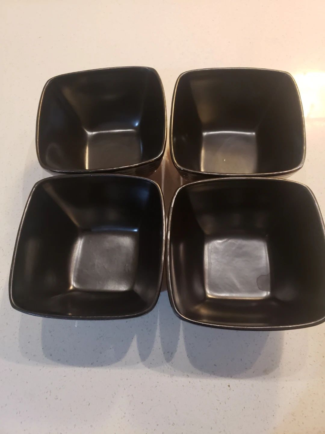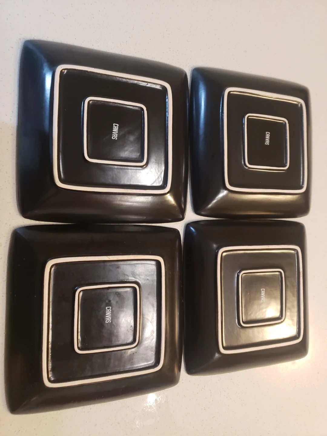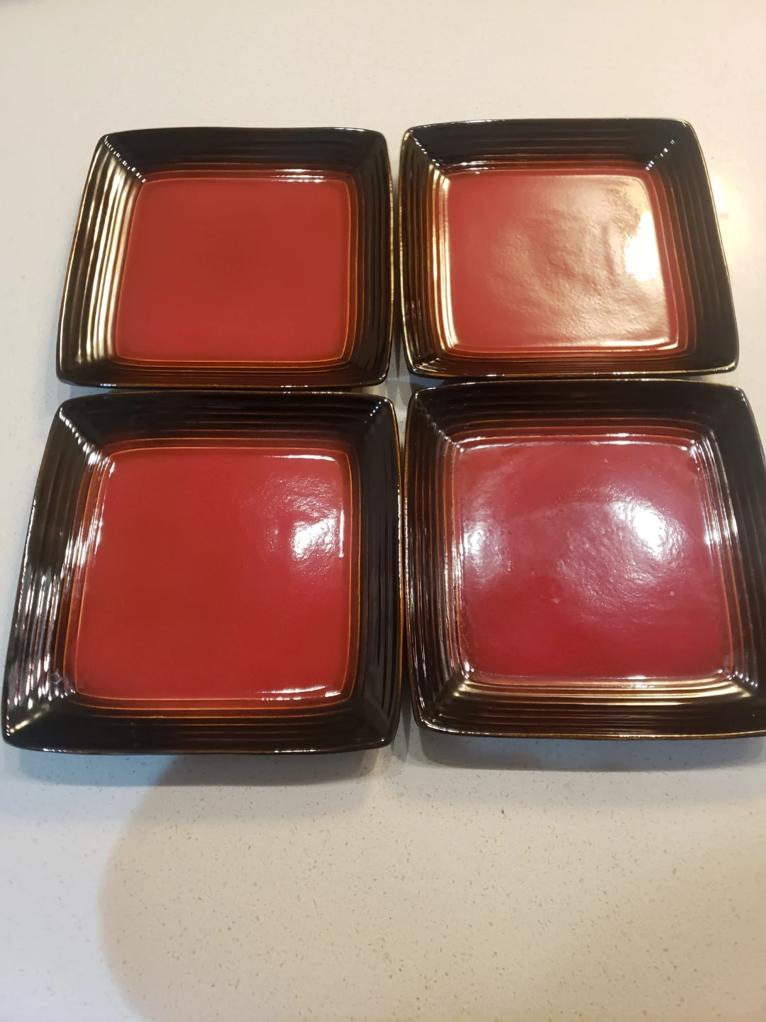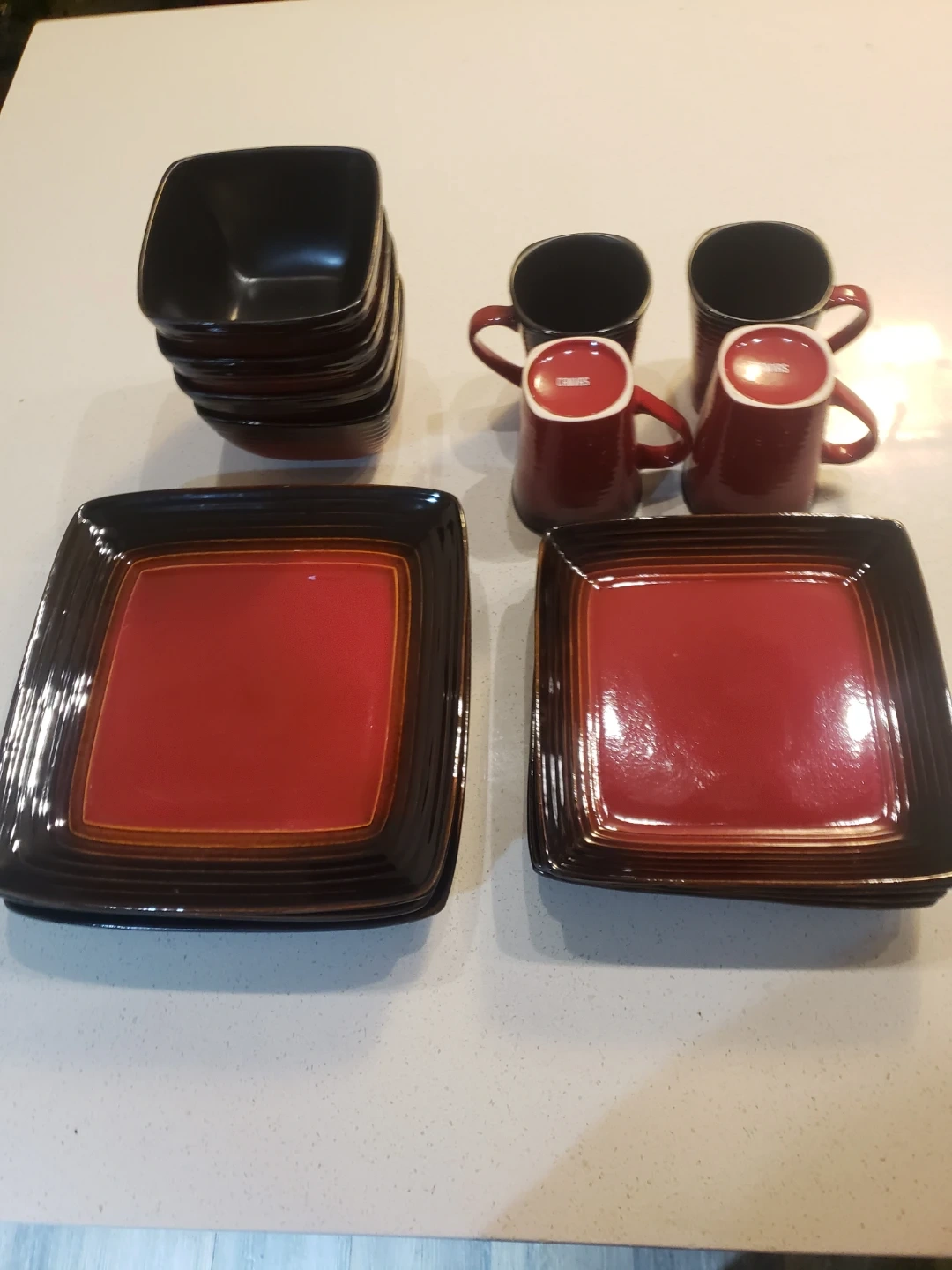 This 12 piece Dinnerware set of has a unique square shape, and features a great color contrast between red and black glaze . 4 large plates, 4 small plates, 4 bowls, 4 mugs. They're perfect for serving both appetizers or main courses. Dishwasher sat