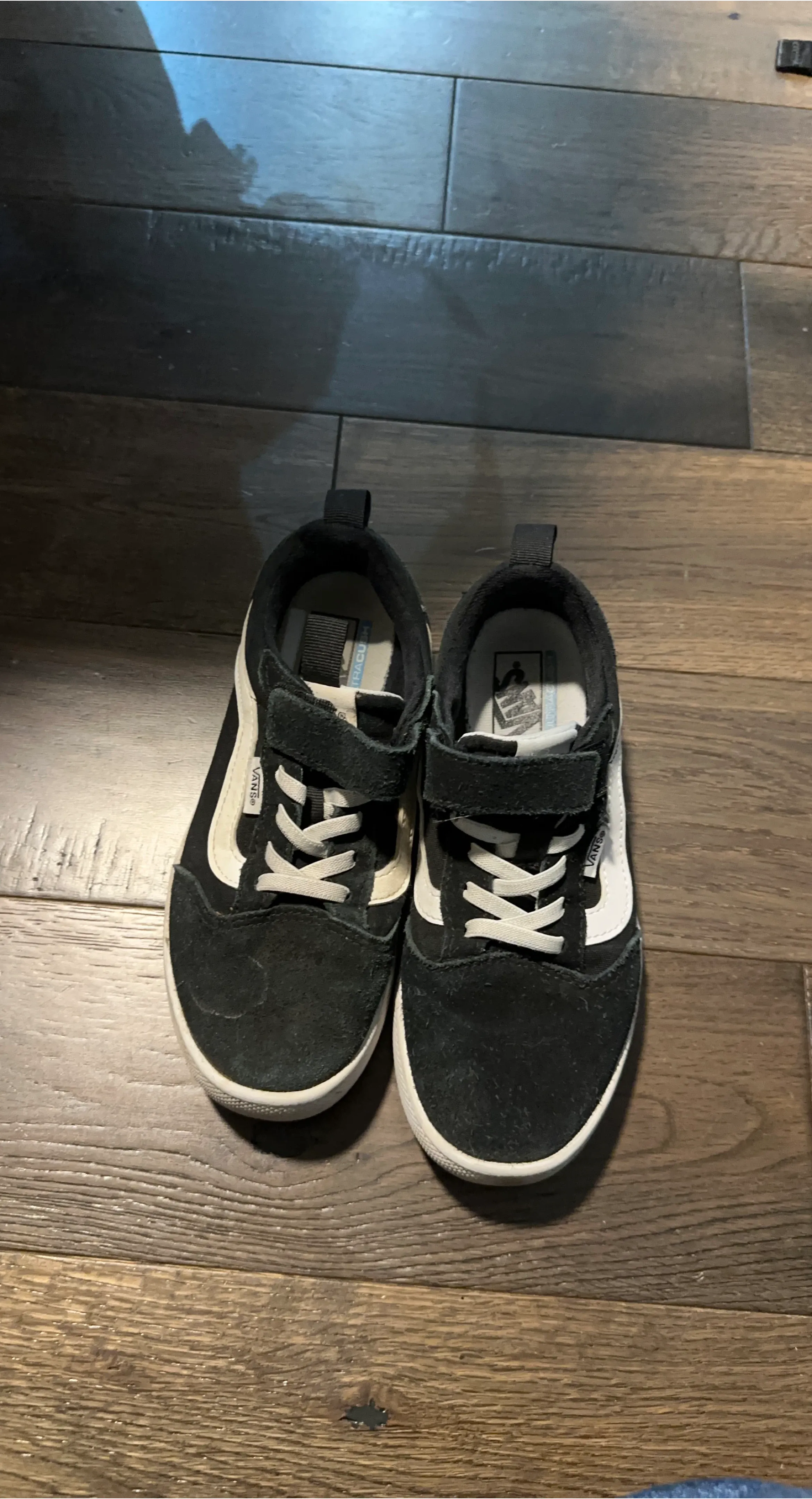 Selling a pair of Vans kids' shoes in black and white. They have a classic look with a velcro strap. Perfect for everyday wear!
