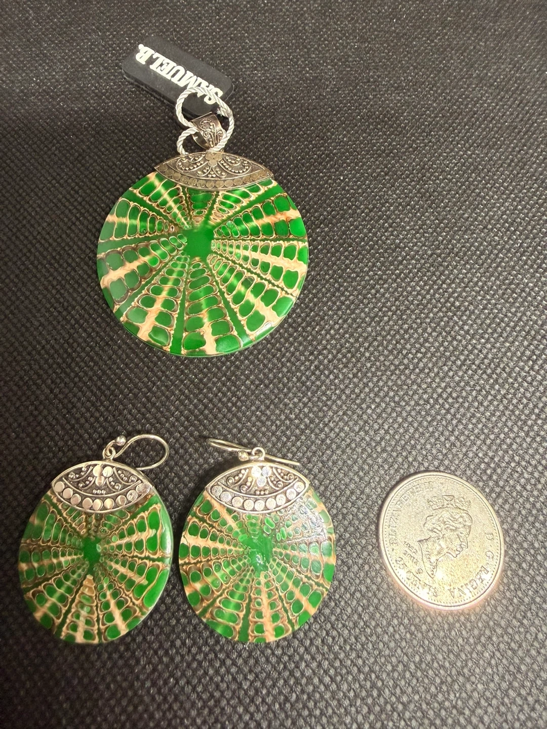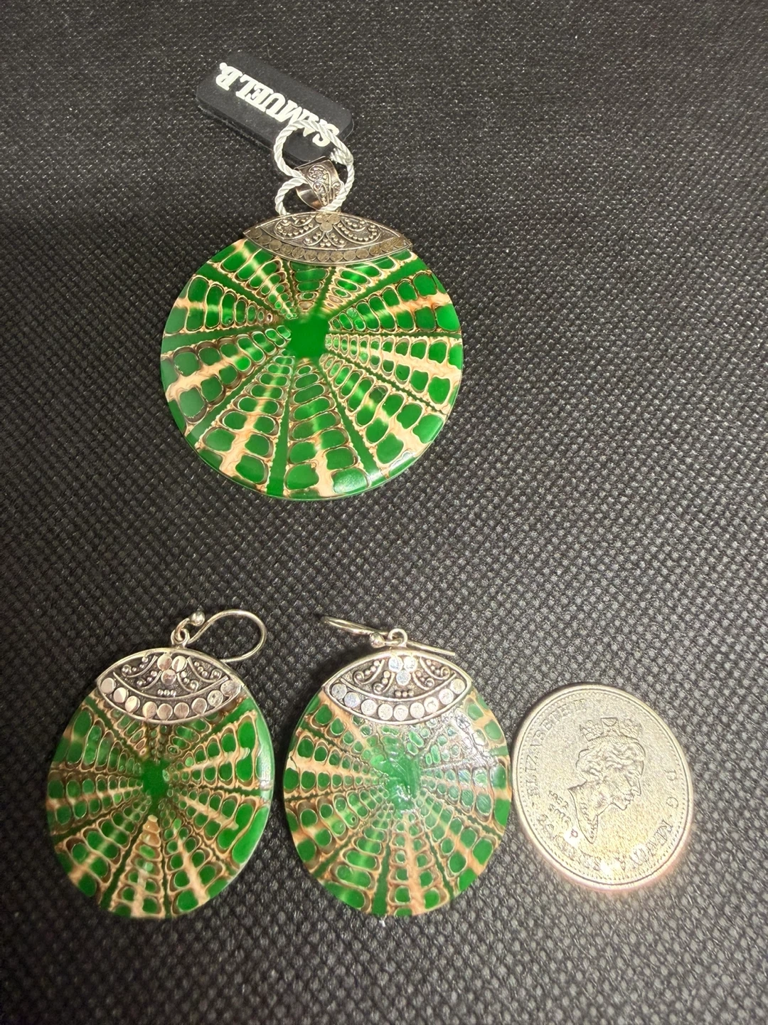 This is a Samuel B. pendant and matching earrings set. The set features a unique green and tan patterned design with silver-tone accents. Great for adding a pop of colour to your outfit!