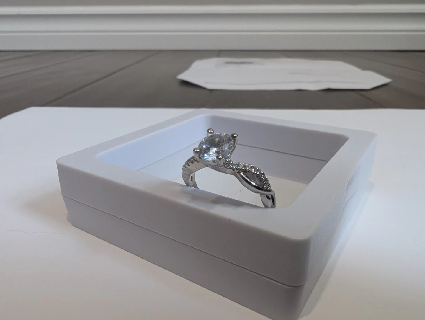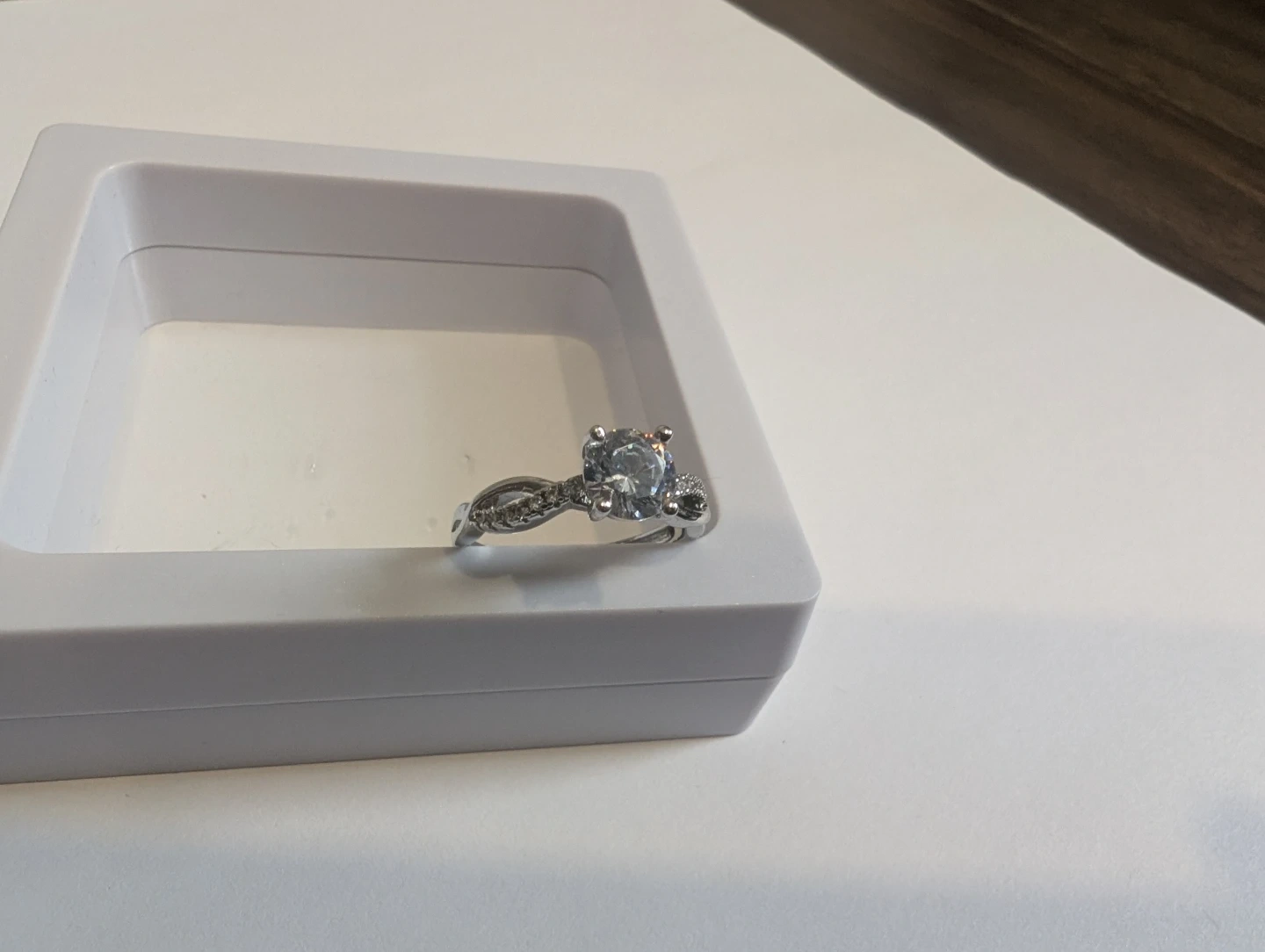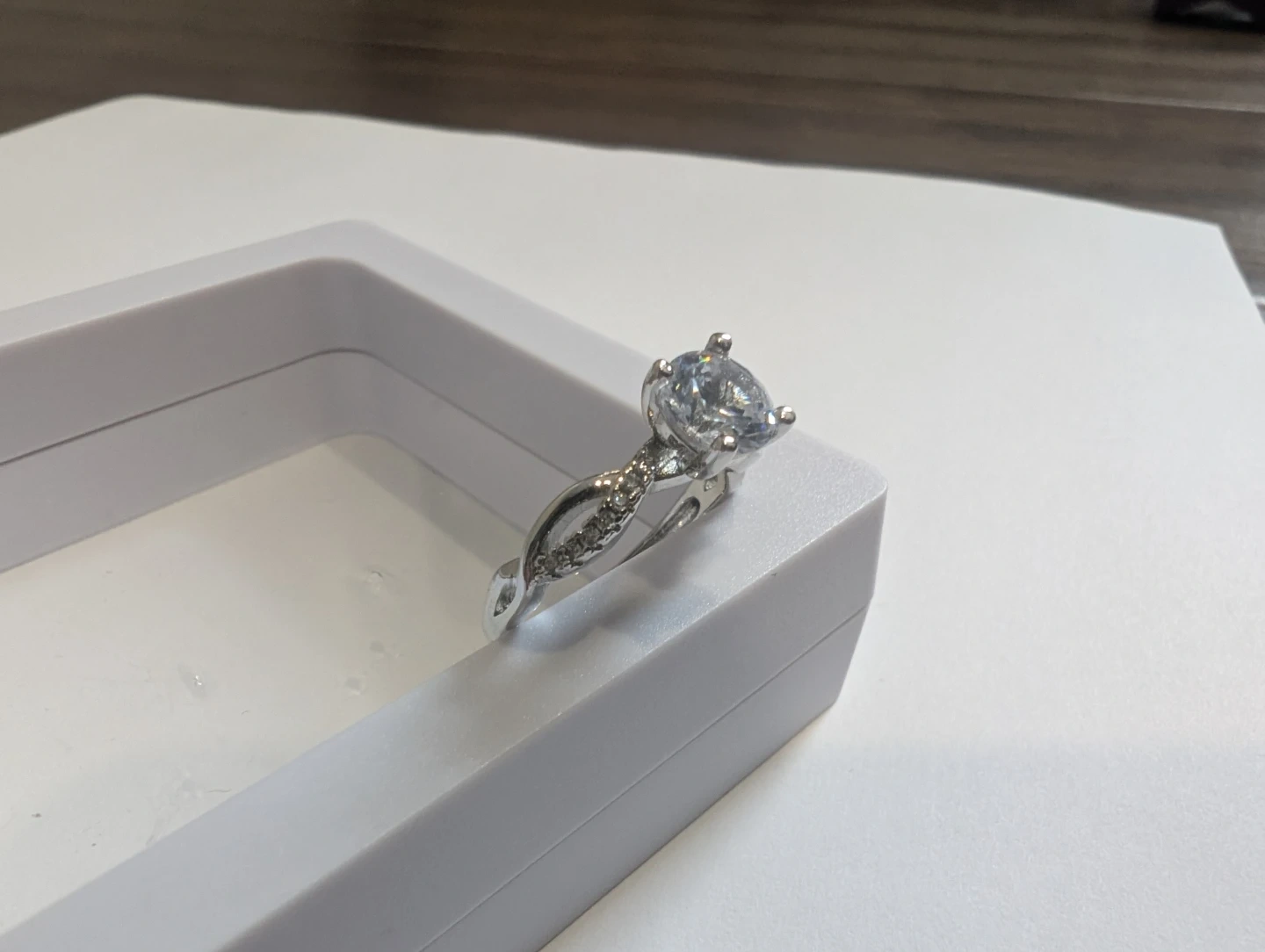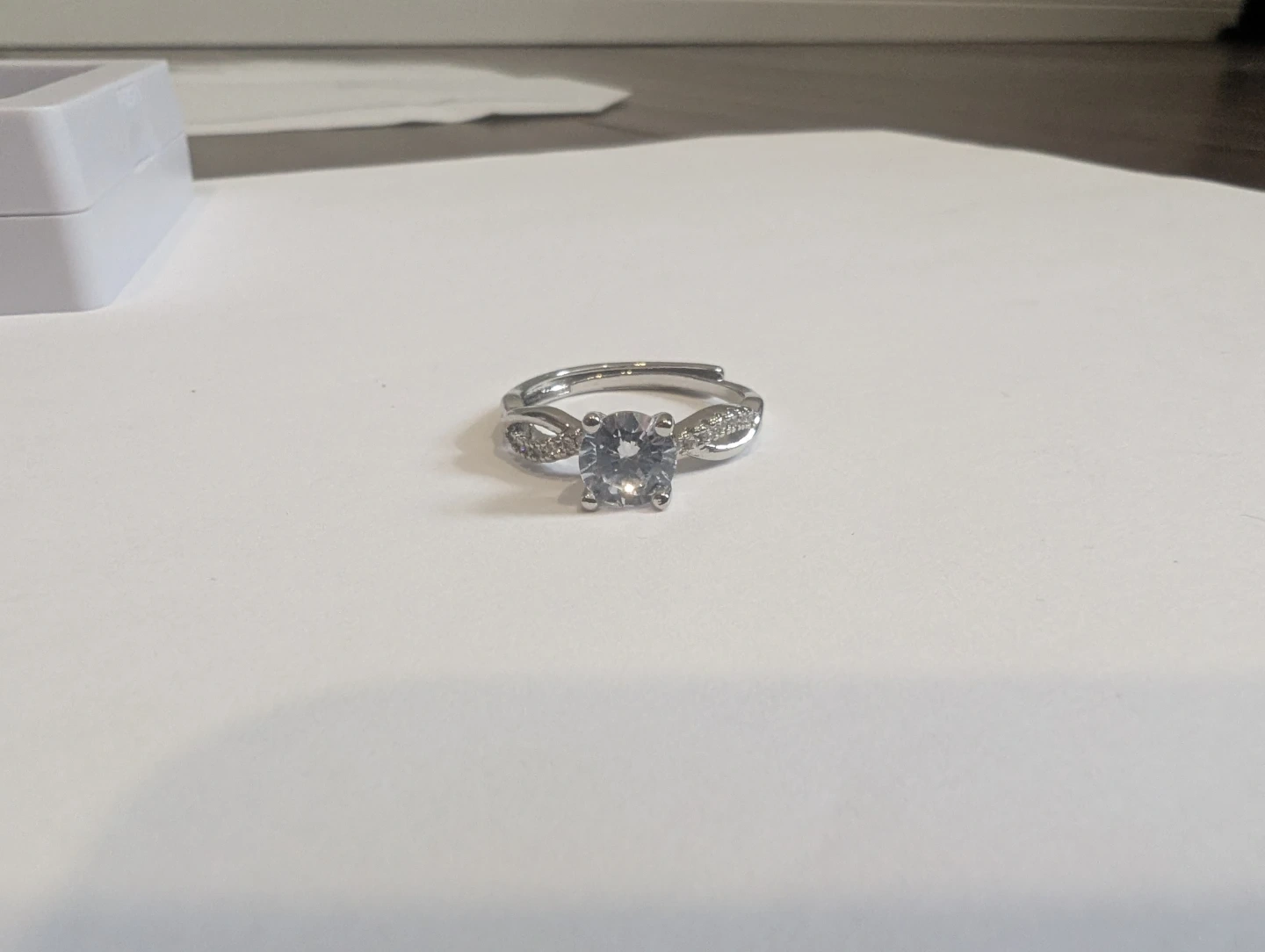 Brand new base metal moissanite diamond ring for sale. Moissanite gemstone, Adjustable fold over ring size, $220 FIRM. Comes with appraisal.