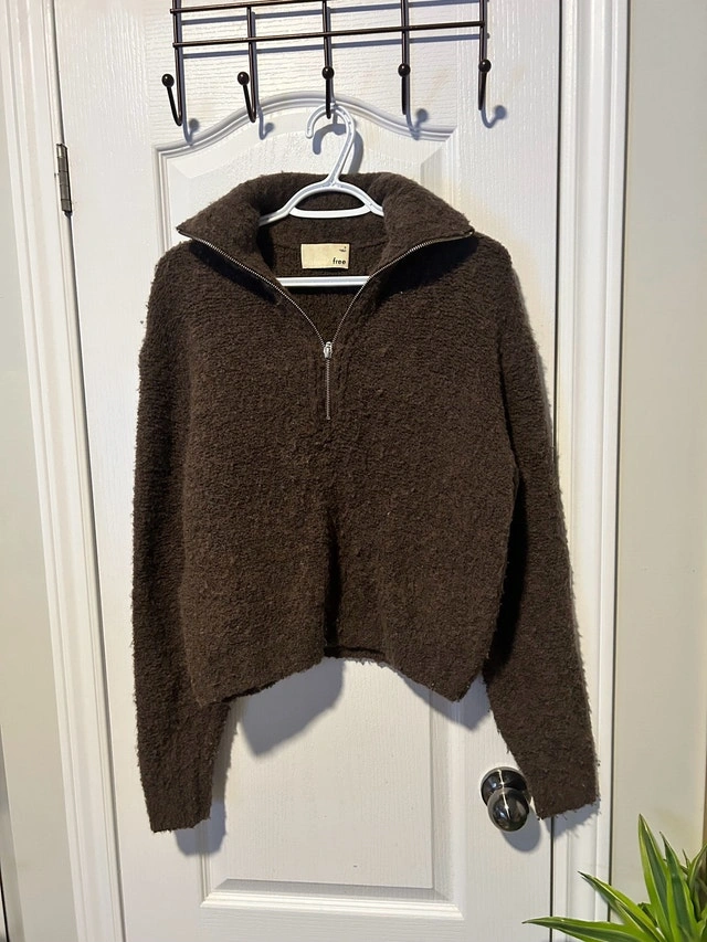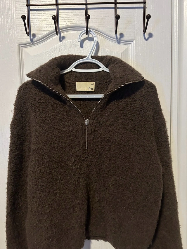 This cozy brown Aritzia quarter-zip sweater, size small, is perfect for adding a touch of warmth to your wardrobe. It's in good, used condition, with some pilling as shown. Brand: Aritzia. Size: Small. Colour: Brown. Looking to declutter, this stylish piece is waiting for a new home! If you're reading this, yes, it's still available!