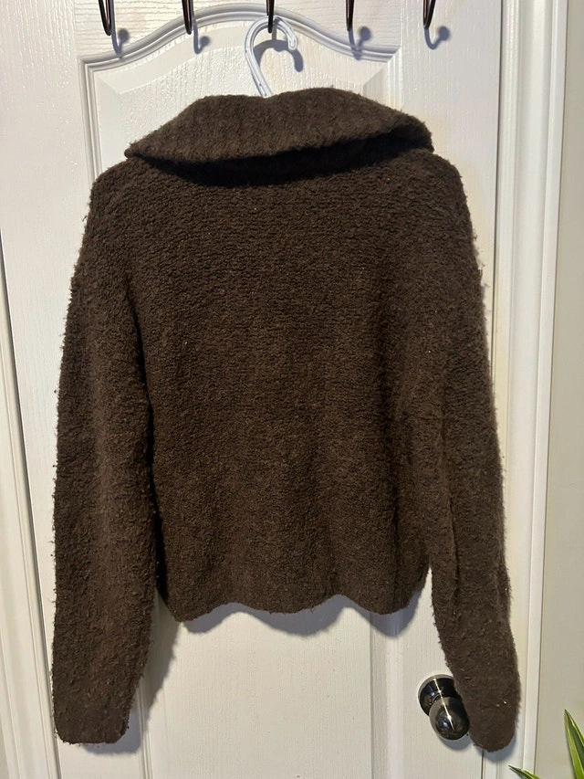 This cozy brown Aritzia quarter-zip sweater, size small, is perfect for adding a touch of warmth to your wardrobe. It's in good, used condition, with some pilling as shown. Brand: Aritzia. Size: Small. Colour: Brown. Looking to declutter, this stylish piece is waiting for a new home! If you're reading this, yes, it's still available!