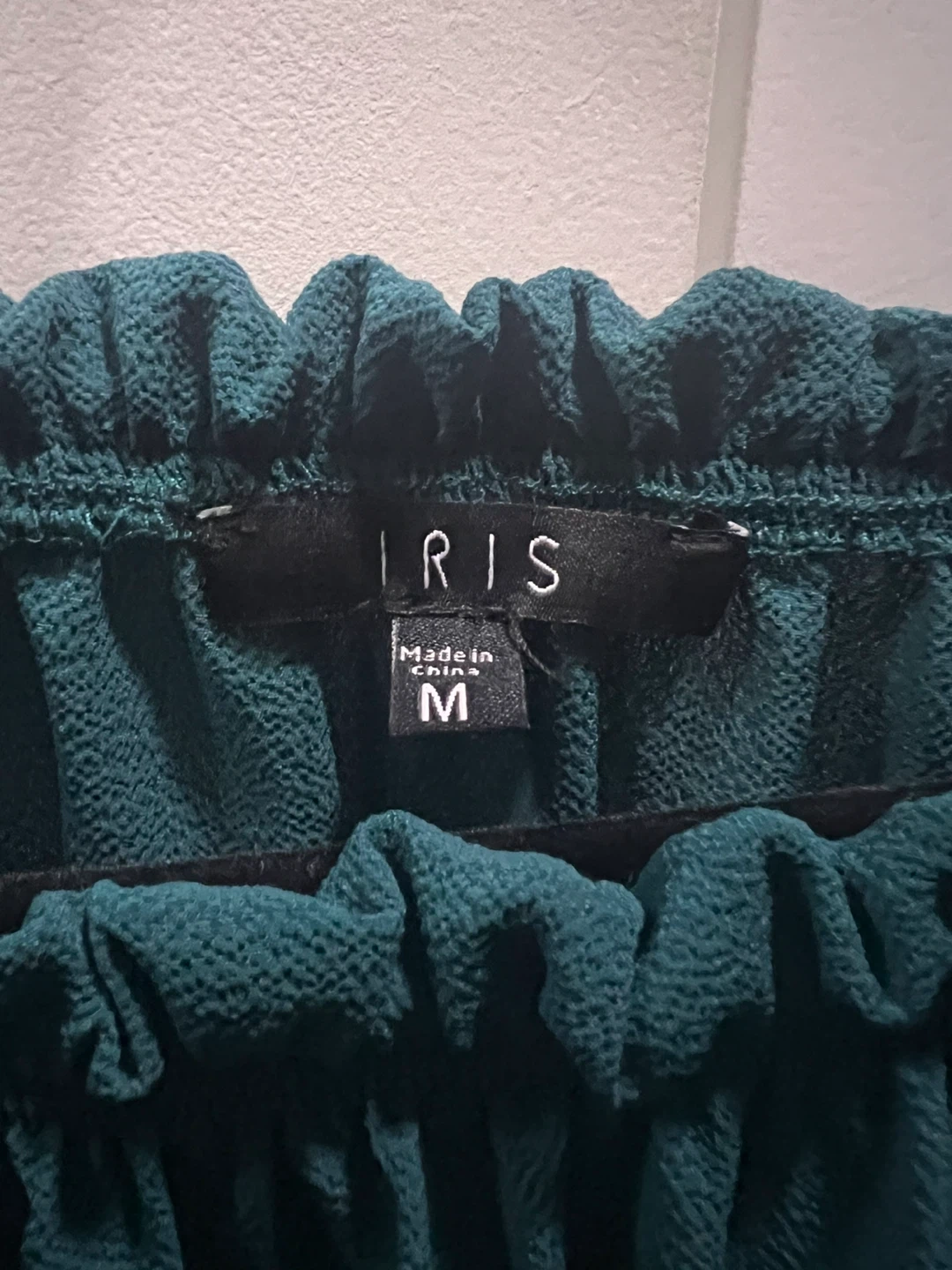 New IRIS brand off-shoulder top in a nice teal colour. It's a size medium. The top has a ruffled neckline and tie details on the sleeves.