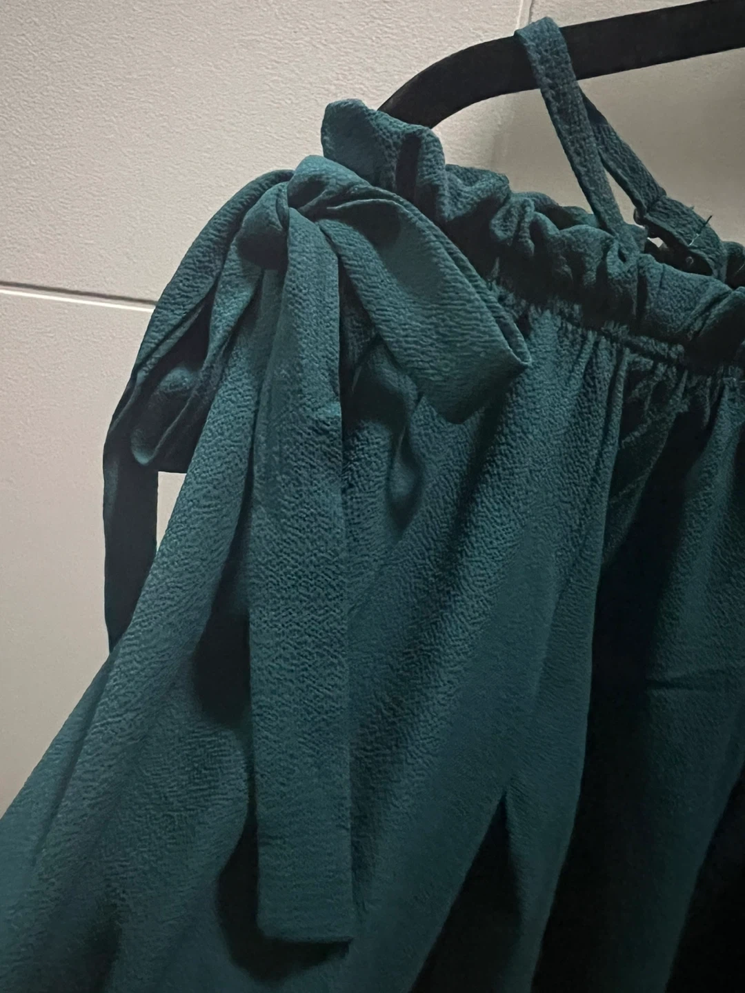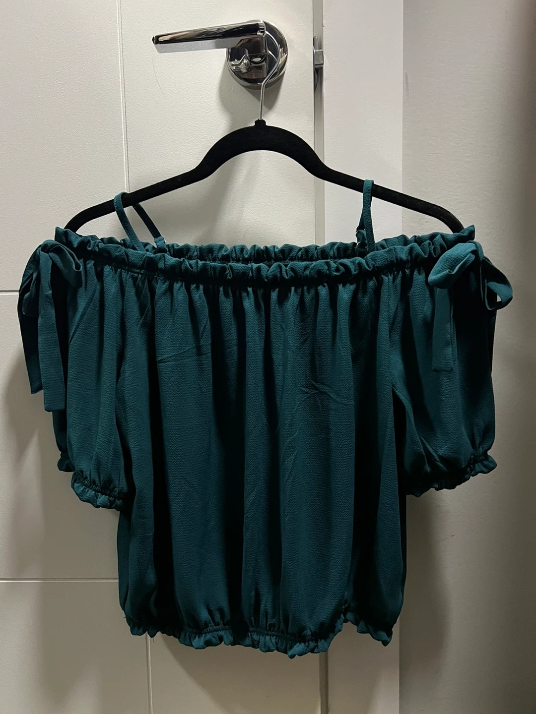 New IRIS brand off-shoulder top in a nice teal colour. It's a size medium. The top has a ruffled neckline and tie details on the sleeves.