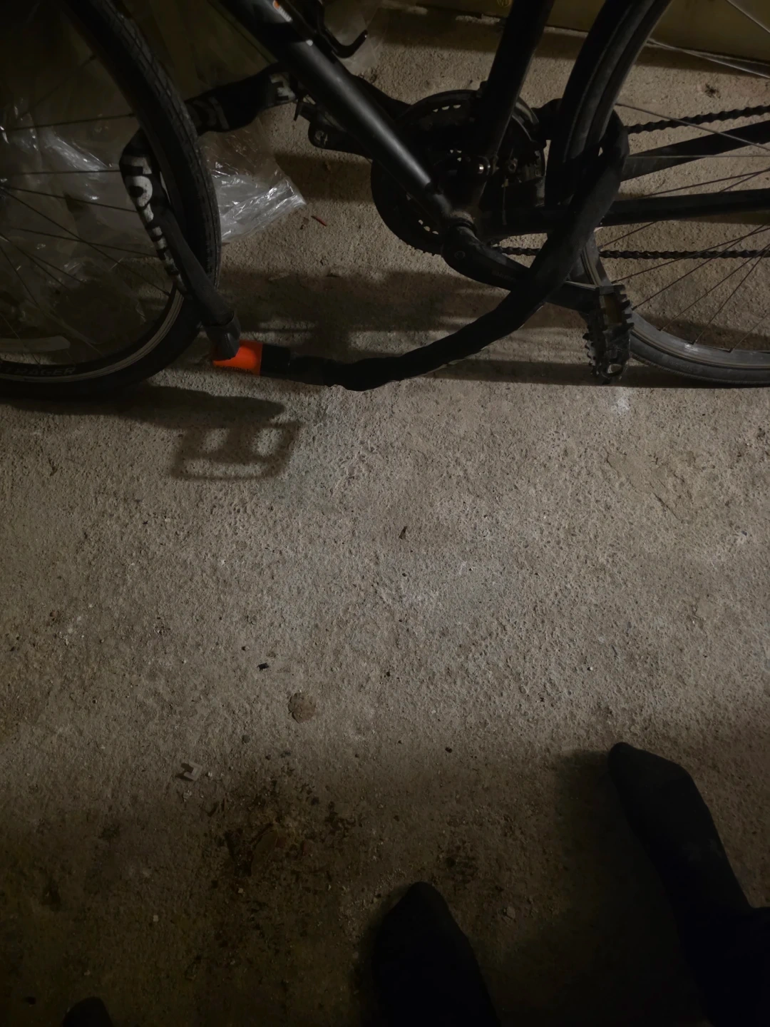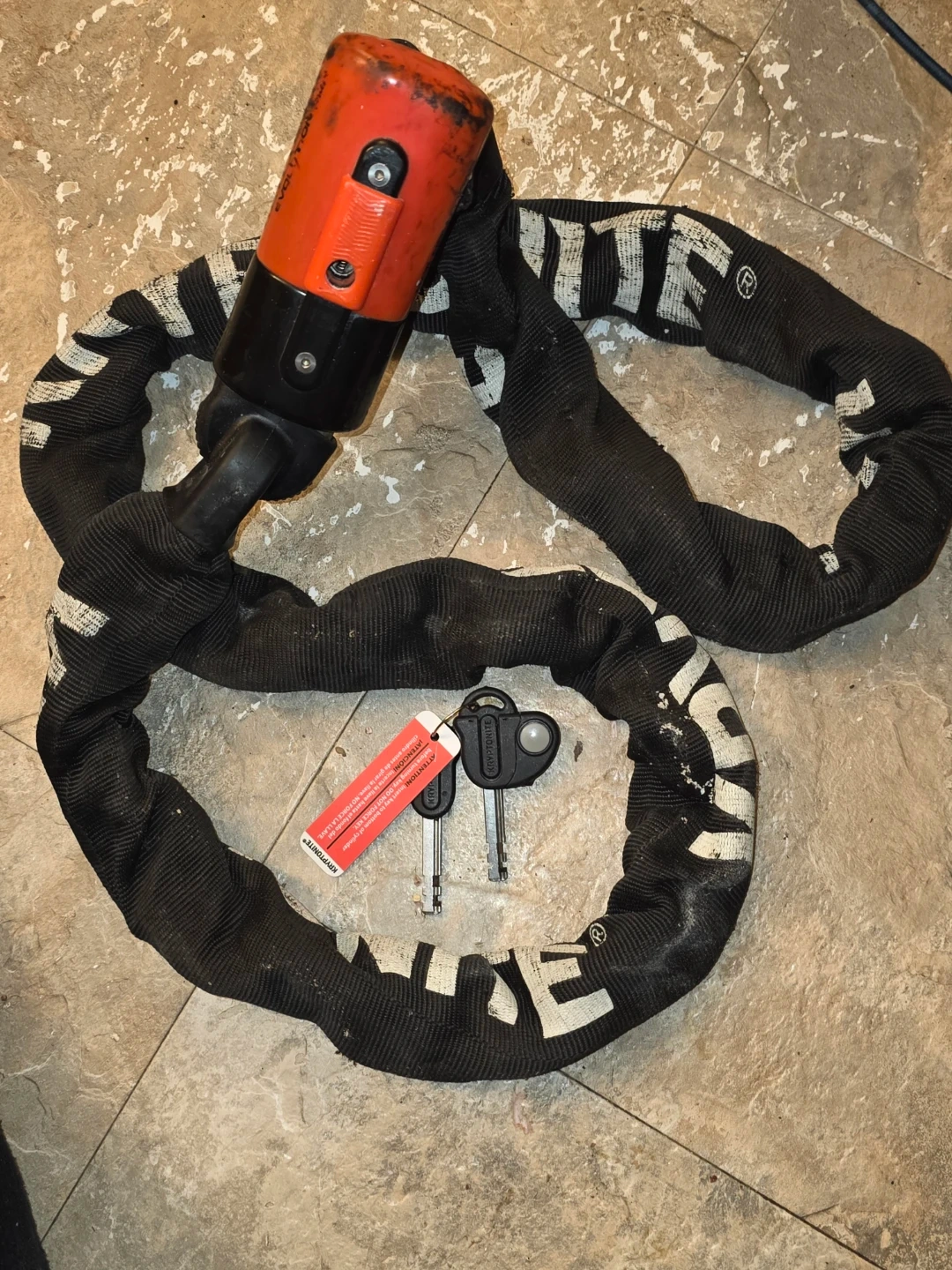 Lightly used. In excellent condition, with only some scuff marks on the integrated lock head. Lock both of your wheels without removing one.