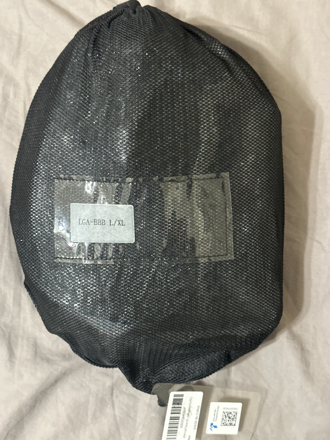 This is a full-face snorkel mask in size L/XL. It includes a mesh storage bag and a small instruction booklet. The mask features a blue snorkel tube and a clear visor.