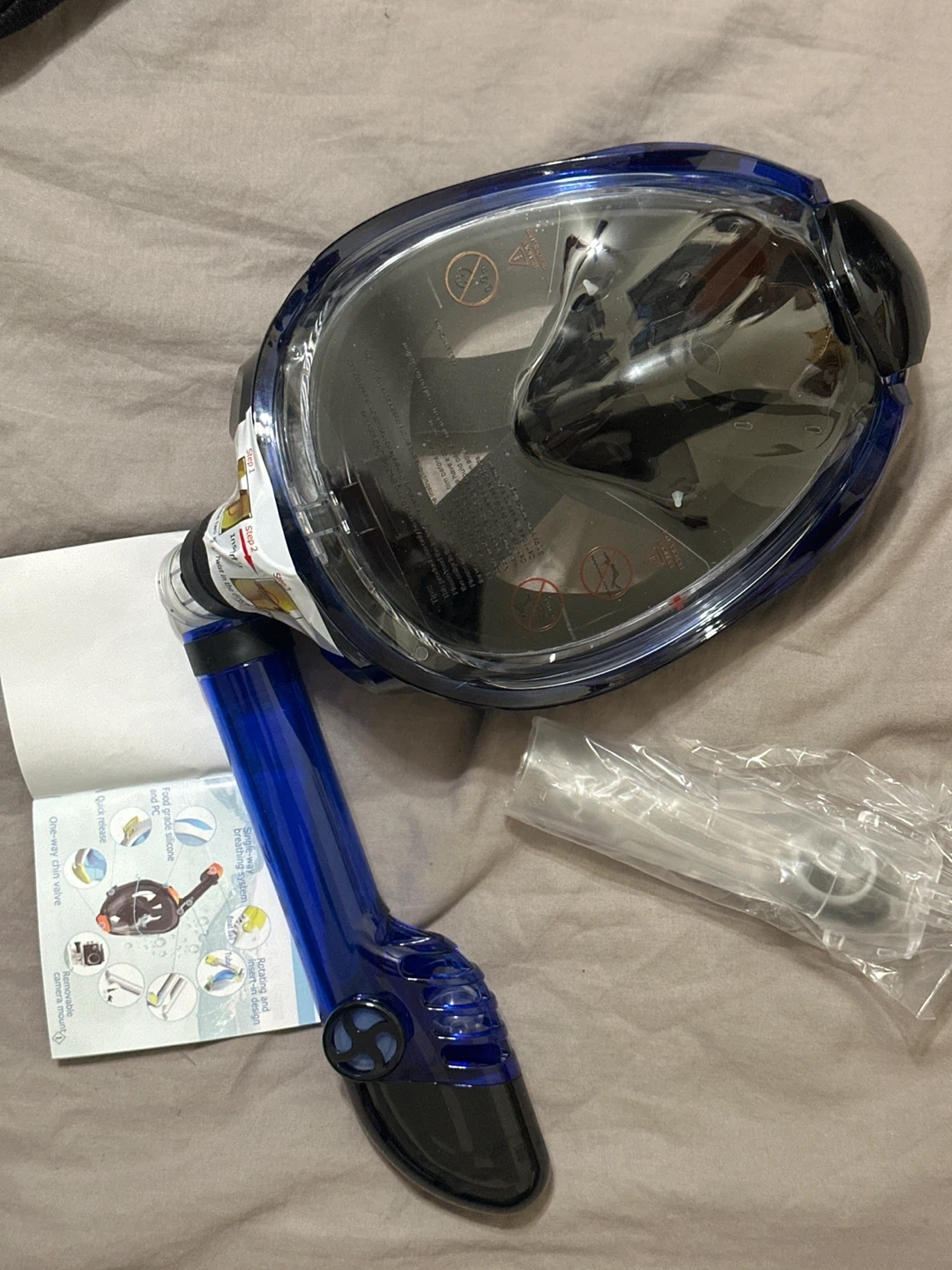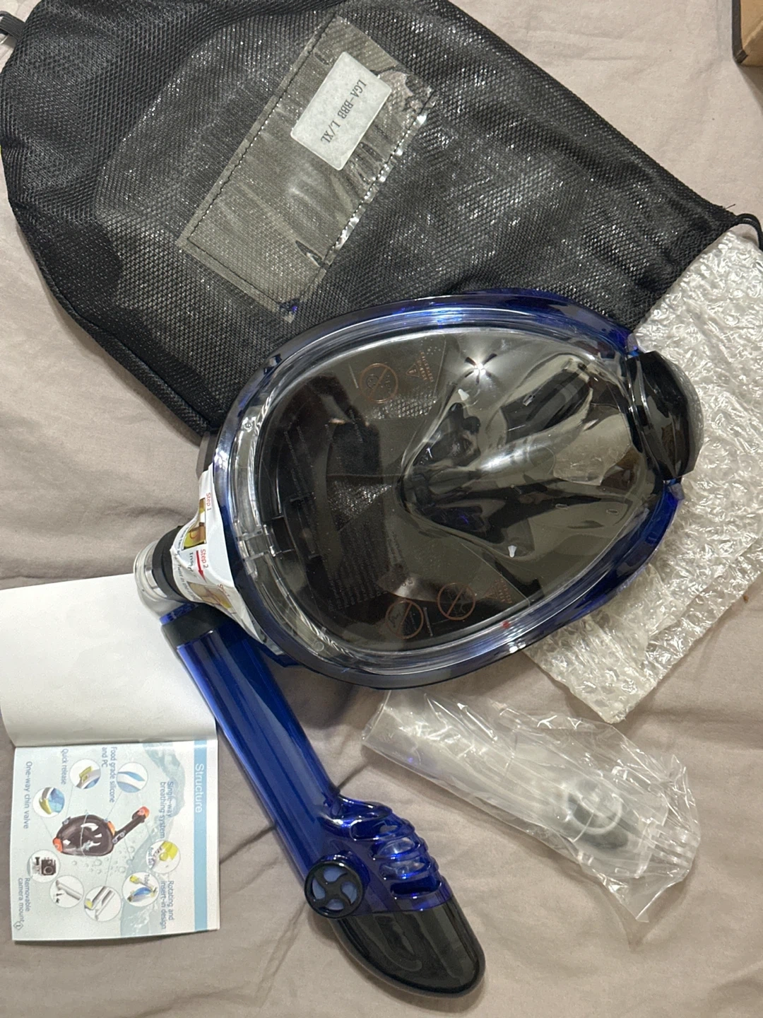 This is a full-face snorkel mask in size L/XL. It includes a mesh storage bag and a small instruction booklet. The mask features a blue snorkel tube and a clear visor.