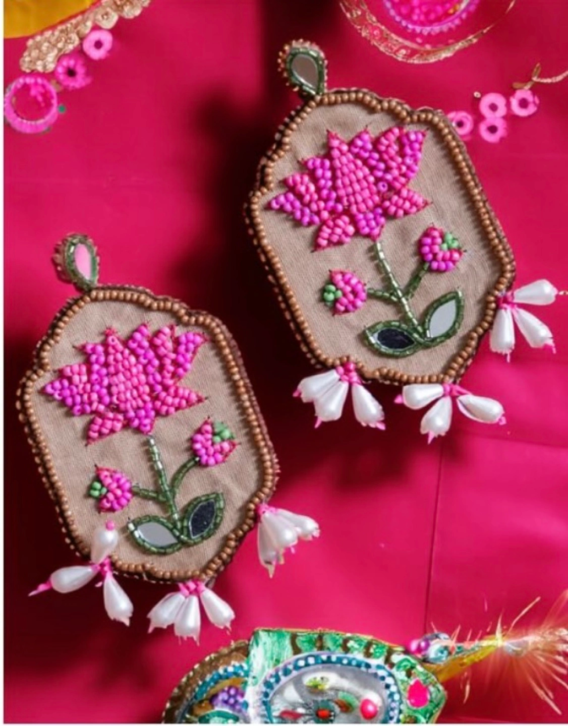 Pair of handmade earrings. Features pink beaded lotus flowers and pearl accents. Rectangular beige fabric base. Unique and elegant design.